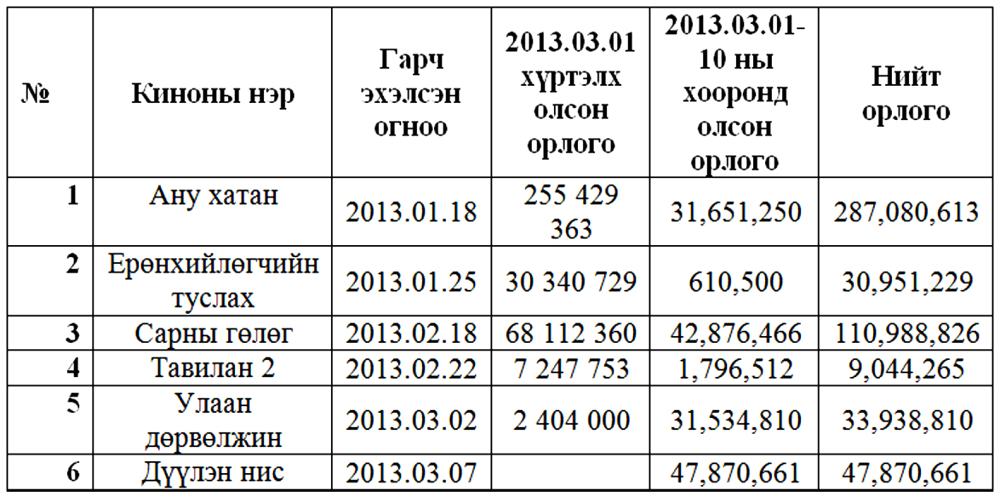 Шударга өрсөлдөөн, хэрэглэгчийн төлөө газраас “Тэнгис”, “Соёмбо”, “Өргөө” кино театрт гарч байгаа Монгол кинонуудын ашиг орлогыг долоо хоног бүр нээлттэй зарлаж байгаа билээ. Өнгөрсөн арав хоногт “Дүүлэн нис” 47 сая, “Ану хатан”, “Улаан дөрвөлжин” кино 31 сая төгрөгийн ашиг олсноор жагсаалтыг тэргүүлжээ.