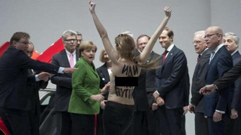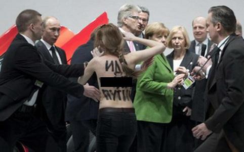 Путин, Меркель нарыг Volkswagen фирмийн асартай танилцаж байхад цээж нүцгэн бүсгүйчүүд сэтгүүлчдийн нүдэн дээр англи хэл дээр бүдүүлэг уриа лоозон хашгиран дайрчээ. Нэг бүсгүйн нуруун дээр бүр “Путин.....руугаа тонил” гэсэн бичиг байсан бол нөгөөгийн нь цээжин дээр “Дарангуйлагч” гэсэн бичиг байж.