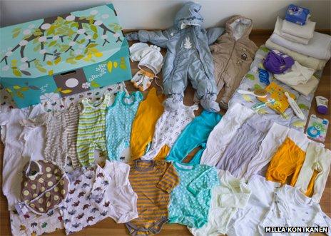 1930-аад онд Финлянд өнөөгийнх шиг баян чинээлэг улс орон болоогүй байсан тэр цаг үед эрх баригчид нь нэгэн ухаалаг шийдвэр гаргасан нь бага орлоготой айл өрхөд мэндлэх гэж буй хүүхдэд зориулан хайрцаг бэлэглэх явдал байв. Хүүхэд унтуулчихмаар аятайхан ч ор дэвсгэргүй ядуу өрхүүдийн хувьд улсаас өгч буй хайрцаг, түүн доторх нярай хүүхдийн хувцас хэрэглэл маш том дэмжлэг болсон нь гарцаагүй. Хайрцагт нярай хүүхдийн хэд хэдэн ээлжийн хувцас, усанд оруулах ариун цэврийн хэрэгсэл, живх, бяцхан хөнжил дэвсгэр, матрас, өвлийн комбинзон, шүд нь ургахаар хазуулах тоглоом, зурагтай ном, бүр эцэг эхэд нь зориулсан бэлгэвч гээд хэрэгтэй бүхэн багтана. Тэр бүхнийг нь аваад хайрцагт нь хүүхдээ унтуулчихна. Ингэж финлянд хүүхэд бүр яг ижилхэн орноос амьдралаа эхэлдэг заншилтай болж. Эхэндээ зөвхөн ядуу өрх айлуудад өгч байсан хайрцаг 1949 оноос бүх айл гэр бүлд хүрдэг болжээ. Энэ нь явсаар бүх хүн ижил тэгш эрхтэй гэдэг хүмүүнлэг ардчилсан нийгмийн үзэл санааг хамгийн тод томруунаар ард иргэдийн амьдралд батлан харуулсан бэлэг тэмдэг болжээ.