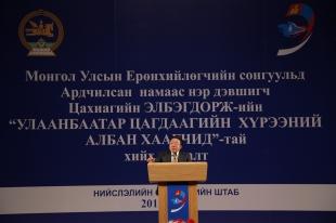 Та бүхний төлөөлөл УИХ-д цөөхөн байж магадгүй. Тэгвэл та бүхний өмнөөс би чанга дуугарч, та бүхний дуу хоолой байж чадна. Засгийн газар, орон нутгийн удирдлагуудыг шаардан ажиллаж чадна. Та бүхэн “Монгол Улсын Ерөнхийлөгч Цахиагийн Элбэгдорж намайг төлөөлдөг юм” хэмээн нүүр бардам хэлж байх хэрэгтэй. Хууль хяналтын байгуулагын нэр хүнд өндөр яваасай гэж би боддог. Монгол Улсад хууль хэрэгждэг гэдгийг та бүхний үйл ажиллагаа бүрэн харуулдаг байгаасай гэж боддог.