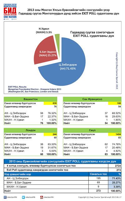 Бид Сонгох Эрхтэй клуб 2013 оны Ерөнхийлөгчийн сонгуульд САНАЛАА ӨГСӨН гадаадад суугаа сонгогчдын дунд хийсэн EXIT POLL cудалгааны дүнг Улаанбаатарын цагаар 2013.06.17-ны өдрийн 14.00 цагт өөрийн фэйсбүүк хуудсаар дамжуулж цахим орчинд танилцуулж байгаадаа таатай байна.