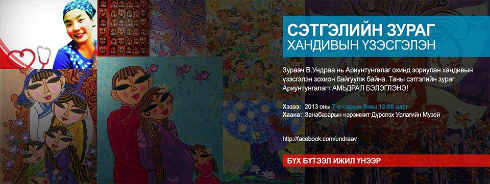 “Шинэ үе урлаг” нийгэмлэгийн зураач В.Ундраа олон улсын тавцанд Монгол Улсныхаа нэрийг өндөрт өргөж яваа залуу уран бүтээлчдийн нэг. Тэрээр эмч нарын буруугаас болж суумгай болсон М.Ариунтунгалаг охинд зориулж “Сэтгэлийн зураг” нэртэй уран зургийн хандивын үзэсгэлэнг энэ сарын 9-нөөс толилуулахаар зэхээд байгаа аж. Дээрх үзэсгэлэн болон түүний уран бүтээлийн тухай ярилцлагыг та бүхэнд хүргэж байна.