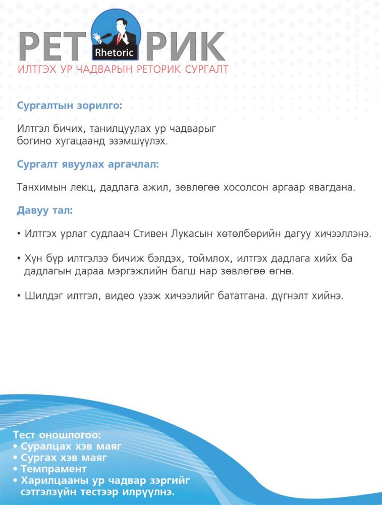 Дээрх 5 зайлшгүй шалтгааны улмаас та бид илтгэх ур чадварт зайлшгүй суралцах ёстой байна. Монголын Лектор төвөөс зохион байгуулдаг илтгэх ур чадварын РЕТОРИК сургалт 2013 оны 11 сарын 25 -нд эхлэх гэж байна. 11 хоногийн хугацаанд амжилт бүтээж, амьдралдаа шинэ боломжийг нэвтрүүлье. Дэлгэрэнгүй мэдээллийг 70111839, 99049075-с лавлана уу.