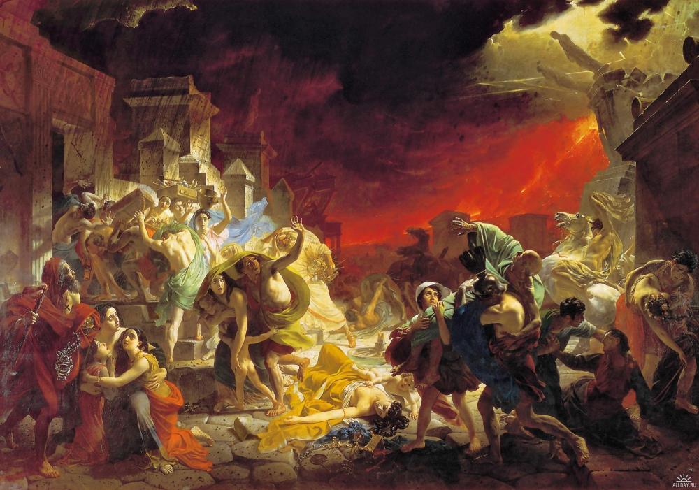 Оросын зураач Карл Павлович Брюлловын / 1799-1852 / олон шилдэг бүтээлийн нэг нь “Помпейн сүүлчийн өдөр” зураг яах аргагүй мөн. Петербург хотноо Уран зургийн академийг А.И.Ивановын урланд суралцаж 1821 онд төгссөн тэрээр дараа жил нь Зураач нарын нийгмэлэгийнхэнтэй Италийг зорьсон байна. Эндээ хэд хэдэн зураг зурсан ч түүхэн сэдэвт “Помпейн сүүлчийн өдөр” зураг зурахаар шийдэж. Ийм түүхэн зураг зурах сонирхол нь төрж газар дээр нь очиж олон эскиз гаргасан гэдэг. Манай эриний 79 онд энэ галт уул хэрхэн оргилж, Помпей хотыг хэрхэн газрын үнс нурам, халуун лаваар дарсан тухай анлийн зохиолч Э.Булвер-Литтоны гурван боть романыг уншиж. Ингээд энэ алдарт зургаа 1830-1833 онд зурж дуусгажээ.