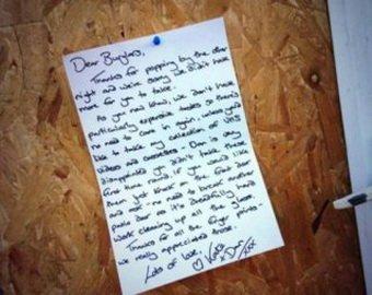 Хаалгыг нь эвдэж гэрт нь орон хулгай хийсэн дээрэмчдэд 36 настай Кейт Баррет зурвас илгээж талархлаа илэрхийлжээ. Тэрээр гэрээс нь үнэ цэнтэй зүйл олоогүй хулгайчдаас уучлал гуйгаад дүрс болон дуу бичлэгийн хальсуудыг нь авмаар байгаа бол дахин манайд “зочилж” болно шүү гэж урьсан байна. Бүсгүй энэ илгээлтээ өөрийнхөө твиттерт бичиж хулгайчдын аваагүй эд зүйлсийнхээ нэрсийг жагсаажээ. Хулгайчдад түүний Ericsson гар утас, Smash Hits-ын хуучин сэтгүүл, Рольф Харрисон гарын үсэгтэй гэрэл зургууд таалагдаагүй үлдээсэн гэнэ.