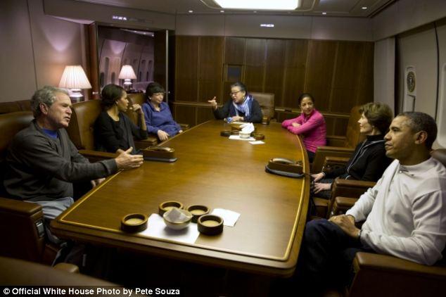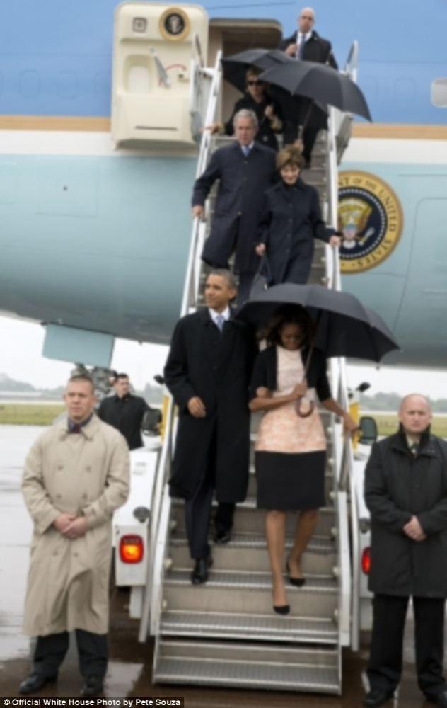 АНУ-ын Ерөнхийлөгч Б.Обама гэр бүлийн хамт Өмнөд Африкийн удирдагч агсан Нельсон Манделаг сүүлчийн замд нь үдэх ёслолд оролцсон. Өнөө цаг үеийн хамгийн агуу хүмүүсийн нэг байсан Н.Манделатай салах ёс гүйцэтгэхээр Б.Обамагаас өмнөх гурван ч экс Ерөнхийлөгч Өмнөд Африкт ирсэн юм. Экс Ерөнхийлөгч Жимми Картер, Билл Клинтон нар тусдаа онгоцоор ирсэн бол Жорж Бушийн гэр бүл, мөн хатагтай Хиллари Клинтон нар Ерөнхийлөгчийн онгоцоор Иоханнесбургт ирсэн ажээ. Өөрөөр хэлбэл, АНУ-ын Ерөнхийлөгчийн онгоцоор хоёр Ерөнхийлөгч, гурван тэргүүн хатагтай зэрэг зорчсон ховор тохиолдол болжээ. Бүхэл бүтэн 17 цаг үргэлжлэх урт нислэгийн үеэр лидерүүдийн гэр бүл тухтай яриа өрнүүлж, Ж.Буш албанаасаа бууснаас хойш хөгжүүлж буй зургийн хоббигоо тэргүүн хатагтай нарт сонирхуулжээ.