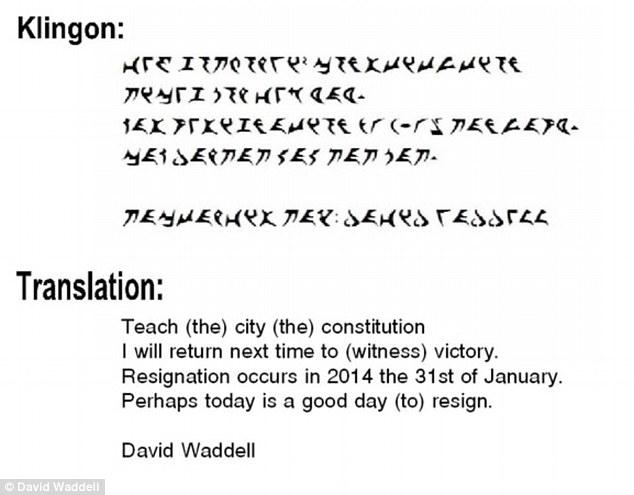 АНУ-ын Хойд Каролина мужийн Индиан Трэйл хотын зөвлөх Дэвид Уаддел албан тушаалаасаа огцрох өргөдлөө "харь" хэлээр бичсэн нь олныг гайхашруулаад байна. Дээхэн үед гардаг байсан "Star Trek" цувралын шүтэн бишрэгч тэрээр албан өргөдлөө клингон хэлээр бичсэн байжээ. Клингон гэдэг нь аль нэг үндэстэн ястны хэл огтхон ч биш бөгөөд зөвхөн "Star Trek" кинонд л гардаг харийнхны хэл бөгөөд тус кино ид алдаршиж байх үед энэ хэлний толь бичиг хүртэл гарч байсан юм. 2000 орчим үгтэй клингон хэлний толь бичиг тухайн үедээ 250 мянгаас дээш хувь борлогдож, үзэгчид энэ хэлийг сонирхон сурах гэж оролдож байсан нь "Star Trek" хэр алдартай кино байсныг гэрчилнэ. Гэвч клингон хэлээр хэн ч албан бичиг үйлдэж байсан удаагүй юм. Харин хотын зөвлөх Дэвид Уаддел суудлаасаа огцрох өргөдлөө клингоноор бичээд хотын захирагчид өгөхдөө магадгүй түүний хэлний мэдлэг маруухан байх гэж бодсон уу дор нь орчуулгыг давхар бичсэн байжээ. Өргөдөлд "Хотынхондоо үндсэн хуулийг зааж таниул. Би дараагийн удаа ялахаар ирэх болно. 2014 оны нэгдүгээр сарын 31-нд огцорно. Магадгүй өнөөдөр огцроход таатай өдөр байх биз" гэсэн байжээ.