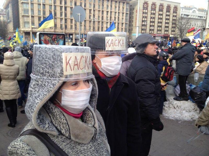 Ямар нэг цуглаан, жагсаалд амны хаалт, малгай, дуулга, бие хамгаалах элдэв хэрэгсэл авч ирэх, нүүрээ халхлахыг хориглосон хуулийг Украин парламент энэ сарын 16-нд гаргасан. Ингэж хүний эрхийг зөрчиж, хэлмэгдүүлсэн энэ хуулийг эсэргүүцэж Киевт болж байгаа жагсаал цуглаанд оролцогсод зөвхөн дуулга ч биш, янз бүрийн “хийцийн малгай дуулга”-тай гарч ирцгээн өнөөгийн төрийн бүтэлгүй улс төрийг эсэргүүцэж байна.