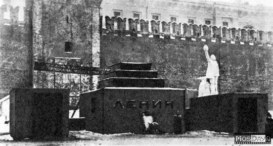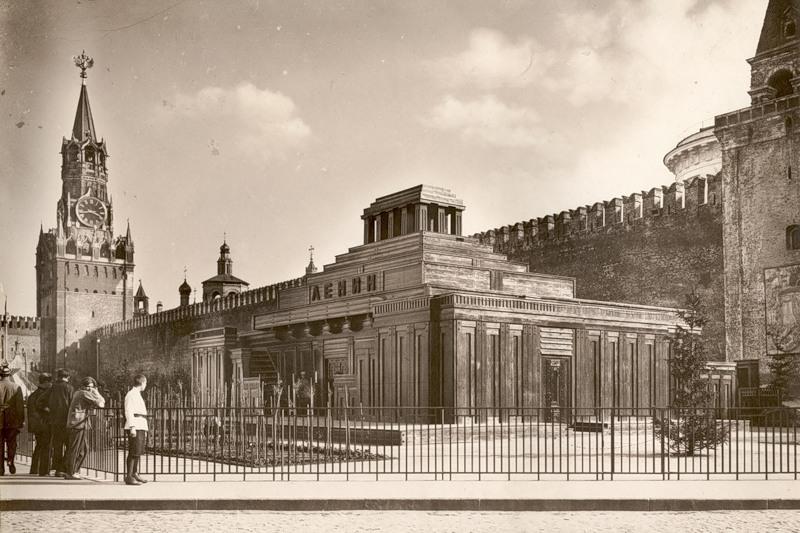 Энэ бүхнээс уран барилгач Алексей Щусевын төсөл шалгарч ердөө зургаа хоногийн дотор анхны модон мавзолейг босгосон байна. Энэ мавзолейг 1924 оны нэгдүгээр сарын 27-ны өдөр нээж их багшийн шарилыг олон нийтэд үзүүлж эхэлжээ.