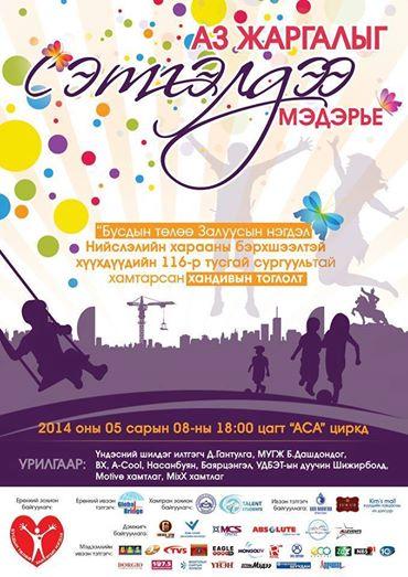 Хүмүүнлэгийн үйлсэд оролцох хүсэлтэй монголын их дээд сургуулиудын төлөөлөл болсон “Бусдын төлөө–Залуусын нэгдэл” нь анхны үйл ажиллагаагаа Нийслэлийн харааны бэрхшээлтэй хүүхдүүдийн 116-р тусгай сургуулийн хүүхдүүдэд бие сэтгэл болоод эд материалын дэмжлэг үзүүлэх зорилготойгоор “Аз жаргалыг сэтгэлдээ мэдэрье” хандивын тоглолтыг тавдугаар сарын 08-нд буюу өнөөдөр 18:00 цагаас “АСА Цирк”-д ганцхан зохион байгуулах гэж байна. Энэхүү үйл ажиллагааг зохион байгуулах үндэслэл нь 2013 оны хавар тус сургуулийн хүүхдүүд МУИС-ийн урлаг зааланд урлагийн тайлан тоглолтоо хийсэн нь залуус бидний сэтгэлд тодоос тод үлдэж эдгээр хүүхдүүдэд туслах юмсан гэсэн чин хүсэлдээ автсаар үүнийгээ ажил хэрэг болгон хэрэгжүүлж байгаа юм.