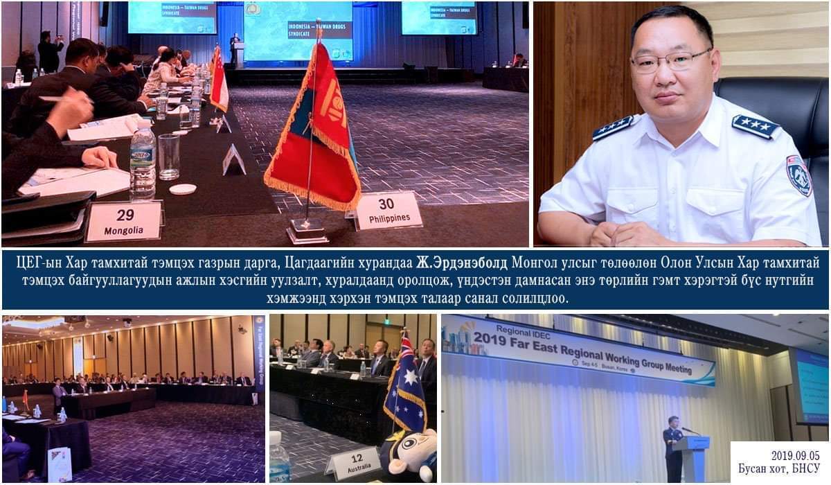 ЦЕГ-ын Хар тамхитай тэмцэх газрын дарга, Цагдаагийн хурандаа Ж.Эрдэнэболд Монгол Улсыг төлөөлөн 2019 оны 09 дүгээр сарын 03-аас 05-ны өдрүүдэд БНСУ-ын Бусан хотод зохион байгуулагдсан Олон Улсын хар тамхитай тэмцэх чиг үүрэг бүхий байгууллагуудын ажлын хэсгийн уулзалт, хуралдаанд оролцлоо.