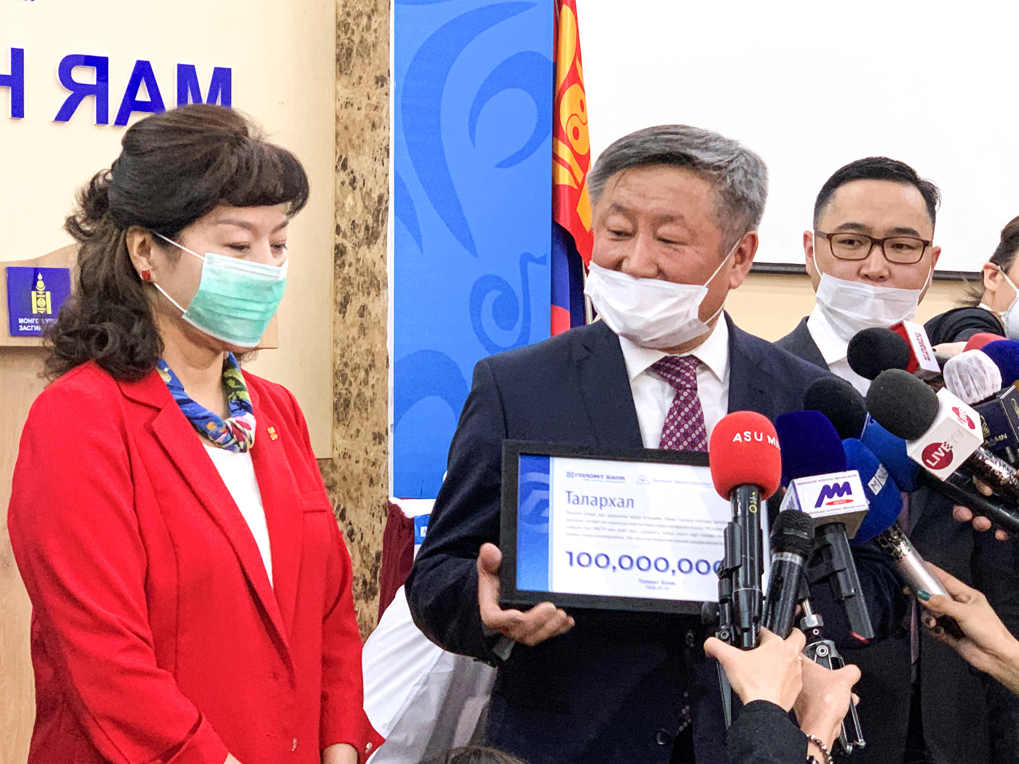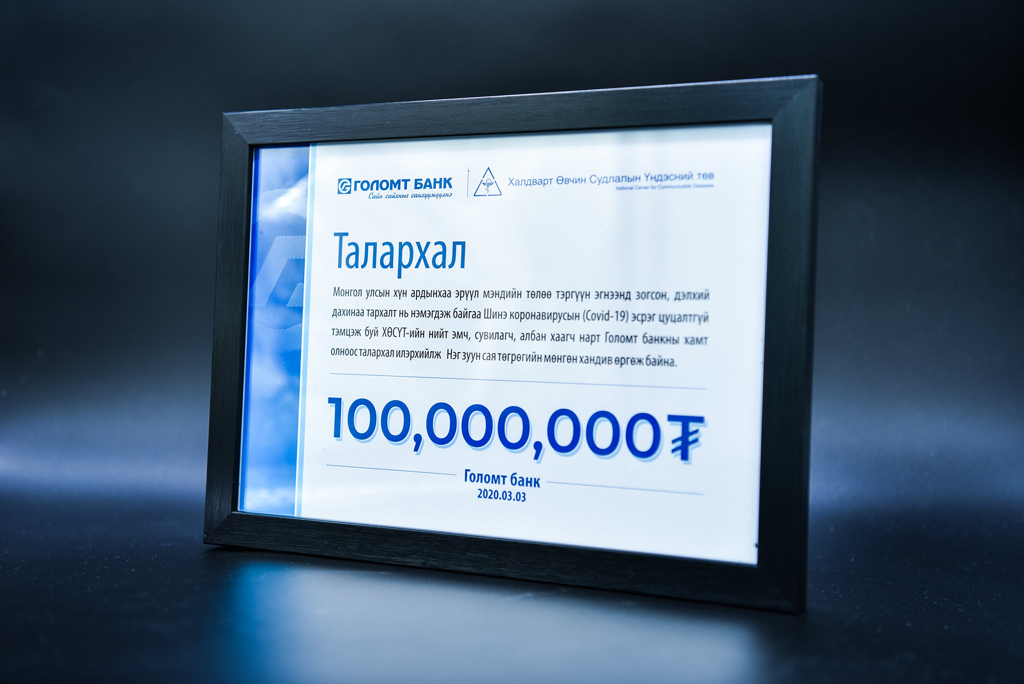 Халдварт өвчний эрсдэлээс улс даяар өрнөж буй урьдчилан сэргийлэх үйл ажиллагааг зохион байгуулж байгаа энэ үед Монгол Улсын хүн ардынхаа эрүүл мэндийн төлөө тэргүүн эгнээнд зогсон, тархалт нь нэмэгдэж байгаа аюулт өвчний эсрэг цуцалтгүй тэмцэж буй ХӨСҮТ-ийн нийт эмч, сувилагч, албан хаагч нарт Голомт банкны хамт олны зүгээс талархал илэрхийлж, 100 сая төгрөгийн мөнгөн хандив өргөлөө.