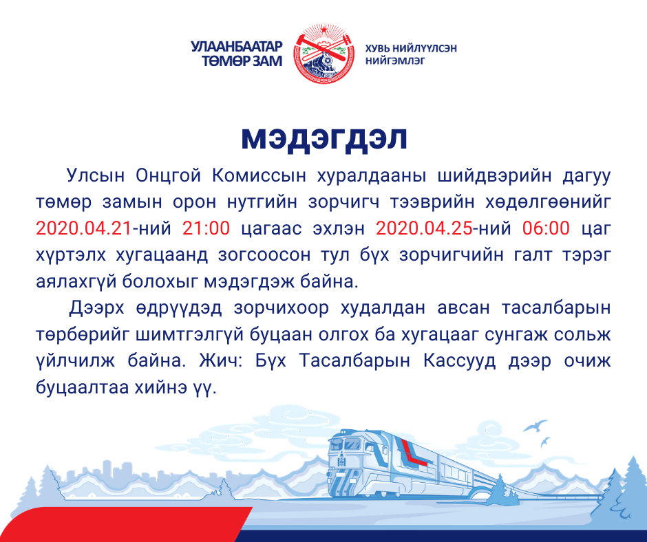 COVID19 цар тахлын халдварын тархалтаас урьдчилан сэргийлэх зорилгоор УОК-ын хуралдааны шийдвэрийн дагуу 4-р сарын 21-ний 21:00 цагаас эхлэн 4-р сарын 25-ны 06:00 цаг хүртэл бүх чиглэлд зорчигчийн галт тэрэгний хөдөлгөөнийг зогсоосныг мэдэгдье!