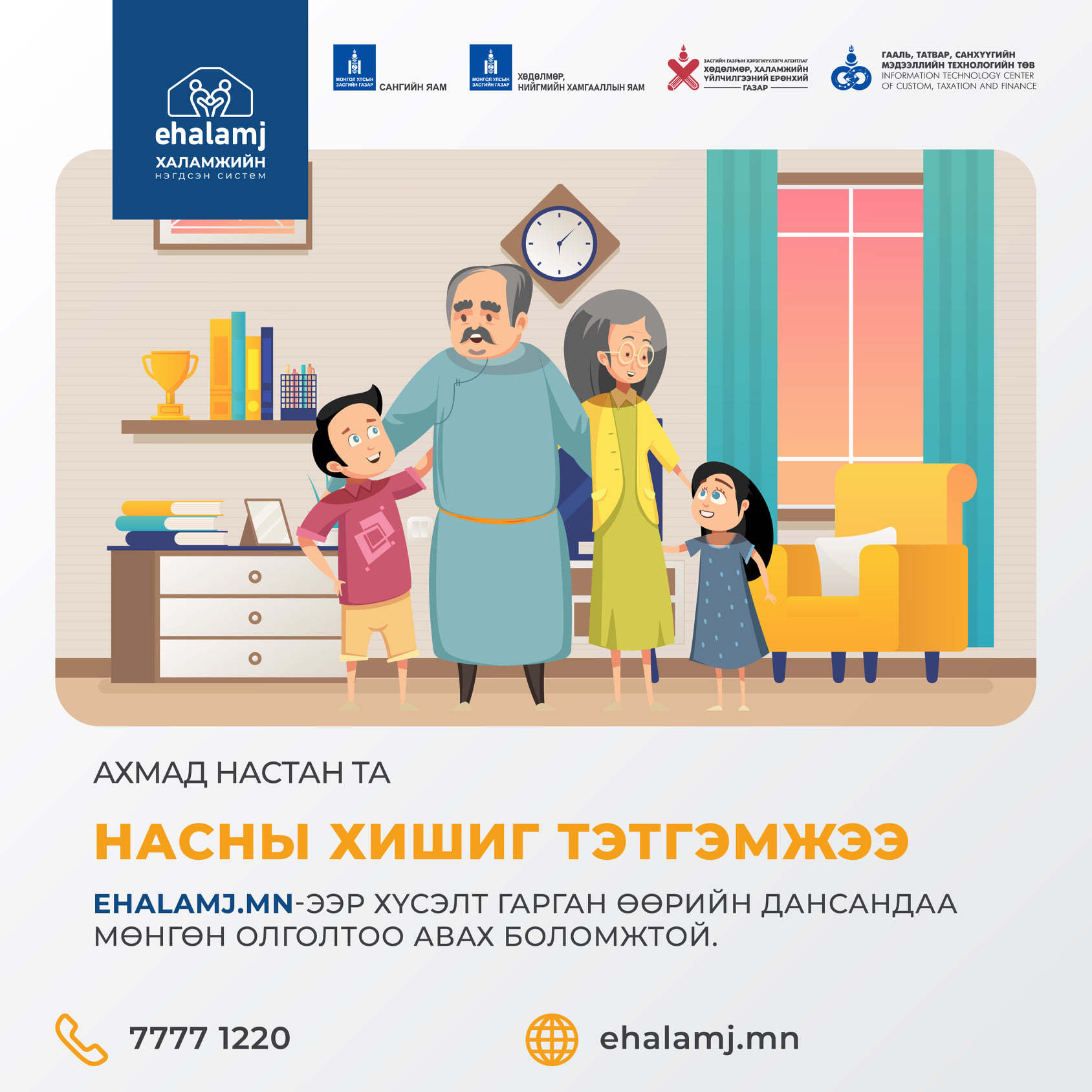 Та яг одоо Нийгмийн халамжийн нэгдсэн систем www.ehalamj.mn -д цахимаар дансаа бүртгүүлээрэй. Ингэснээр “Насны хишиг”-ийн тэтгэмжээ банканд дугаарлахгүй шууд данс руугаа авах боломжтой.