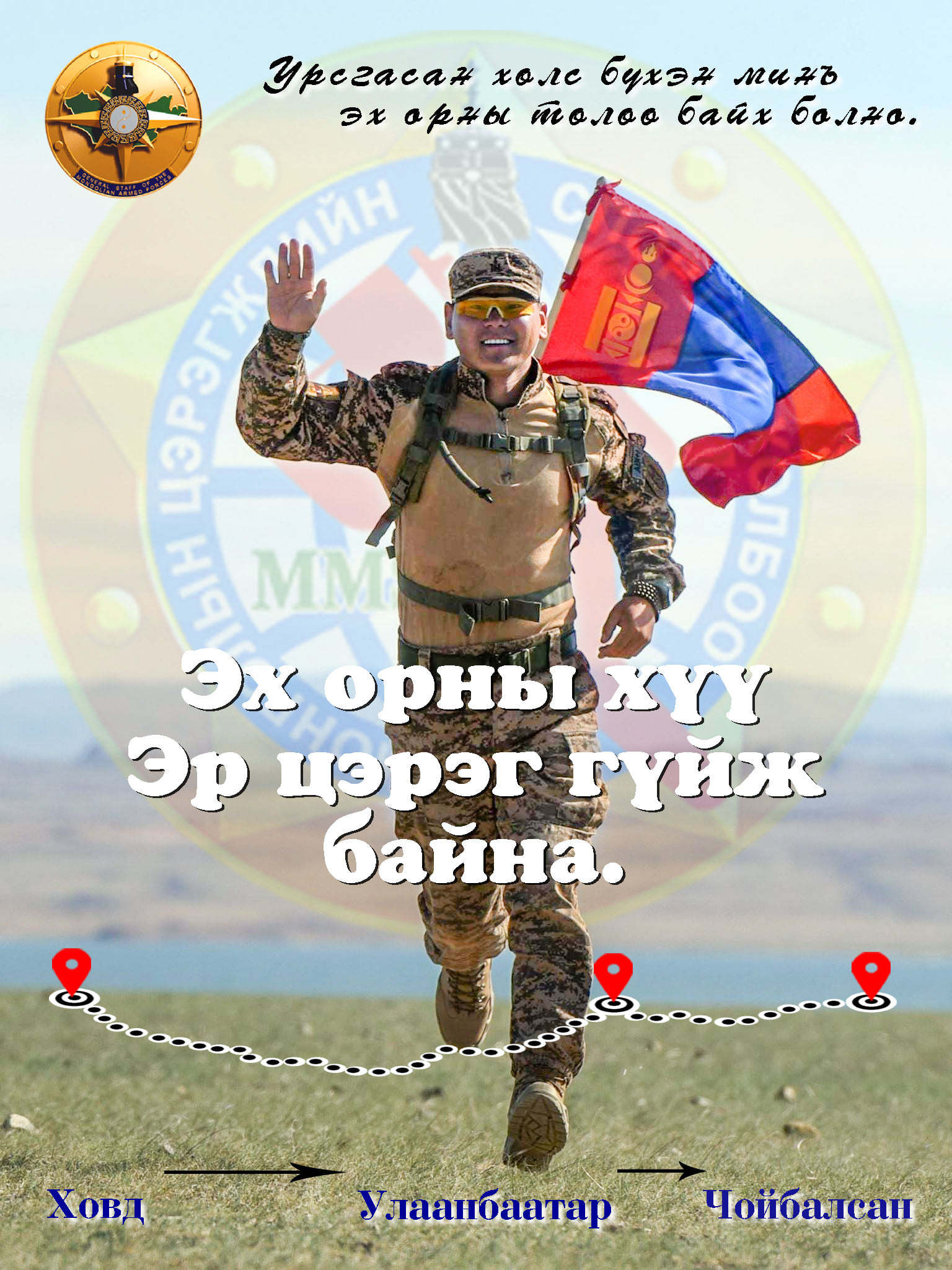 -Ямар ч асуудалгүй. БНӨСУ-ын тэр их халуунд дуулга, буутай үүрэг гүйцэтгэж байсан надад одоо ус үүрсэн цүнхнээс өөр ачаа алга. Хүмүүс надаас асууж байна л даа. Та “Зэвсэгт хүчнийхээ өмнөө барьдаг мэргэжлийн тамирчин уу?” гэж. Тэгэхээр нь би хэлдэг юм. “Би уралдаан тэмцээнд төдийлөн оролцож байгаагүй жирийн нэгэн албан хаагч. Манай Зэвсэгт хүчинд мэргэжлийн тамирчин маш олон байгаа. Өнөөдрийн гүйлт Зэвсэгт хүчний жирийн нэгэн алба хаагч ямар их тэсвэр хатуужил, эр зориг гаргаж чаддаг бэ гэдгийг өөрөөрөө харуулахыг зорьж явна аа. Над шиг мянга мянган офицер, ахлагч миний ард байгаа” гэж хэлдэг юм. Гүйж эхэлсэн 27 хоногийн хугацаанд Зэвсэгт хүчний алба хаагчид нэгэндээ ямар их хайртай, амь нэгтэй байдаг вэ гэдгийг мэдрээд сайхан байна. Энэ ташрамд, өдөр тутамдаа мэргэжлийн дэмжлэгээр хангаж байгаа Зэвсэгт хүчний 123 дугаар анги, Хуурай замын цэргийн командлал, Зэвсэгт хүчний Жанжин штабын удирдлагадаа баярлаж буйгаа илэрхийлье. Намайг дэмжиж байгаа хэн бүхэнд хэлэхэд эх орны хүү нь та бүхнийхээ итгэлийг алдахгүй ээ, зорьсон газраа заавал хүрнэ ээ.