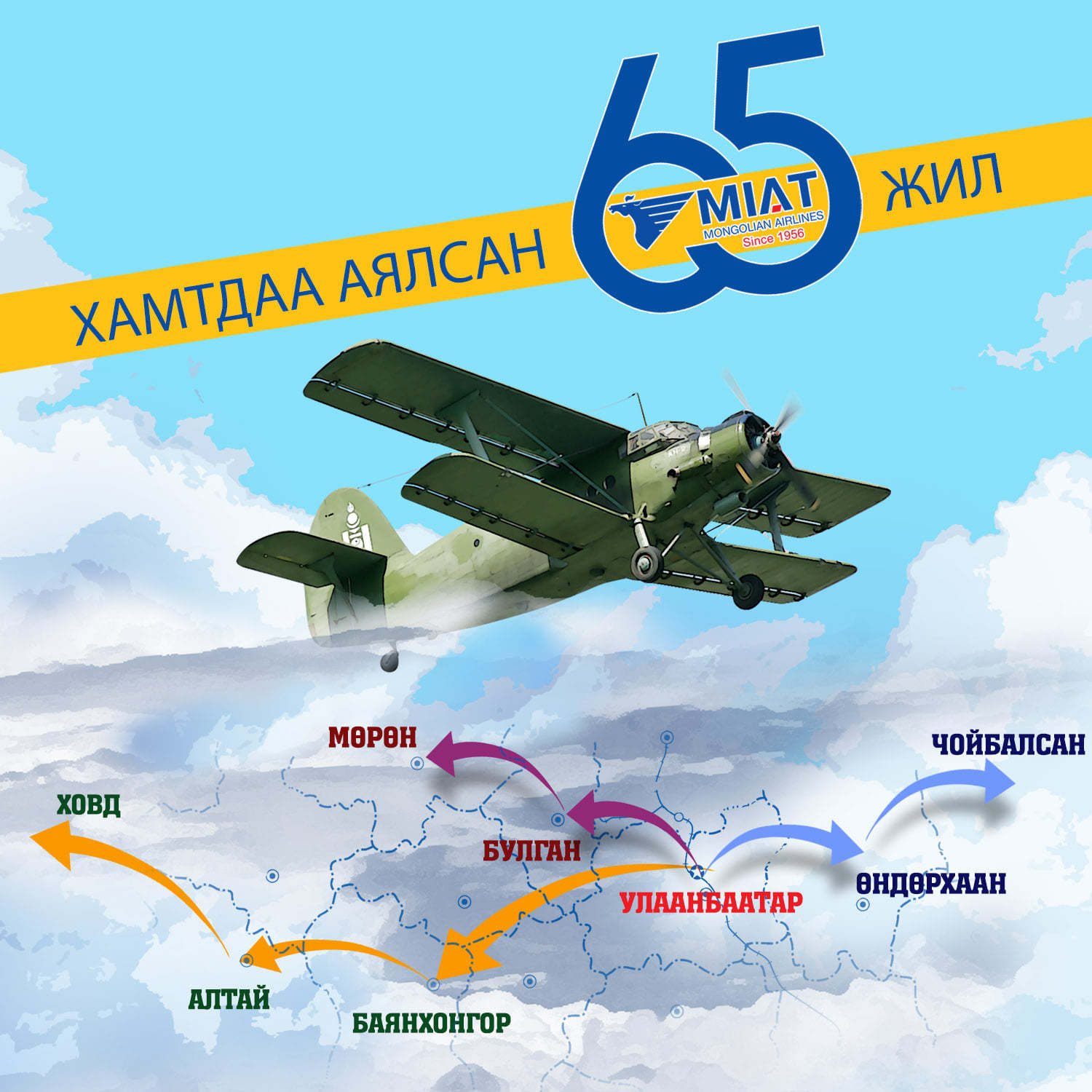 Үндэсний агаарын тээвэрлэгч МИАТ-ТӨХК-ийн үе үеийн ажилчид, албан хаагчиддаа болон бидэнтэй хамт 65 жил аялсан нийт зорчигчиддоо 65 жилийн ойн баярын мэндийг хүргэе.