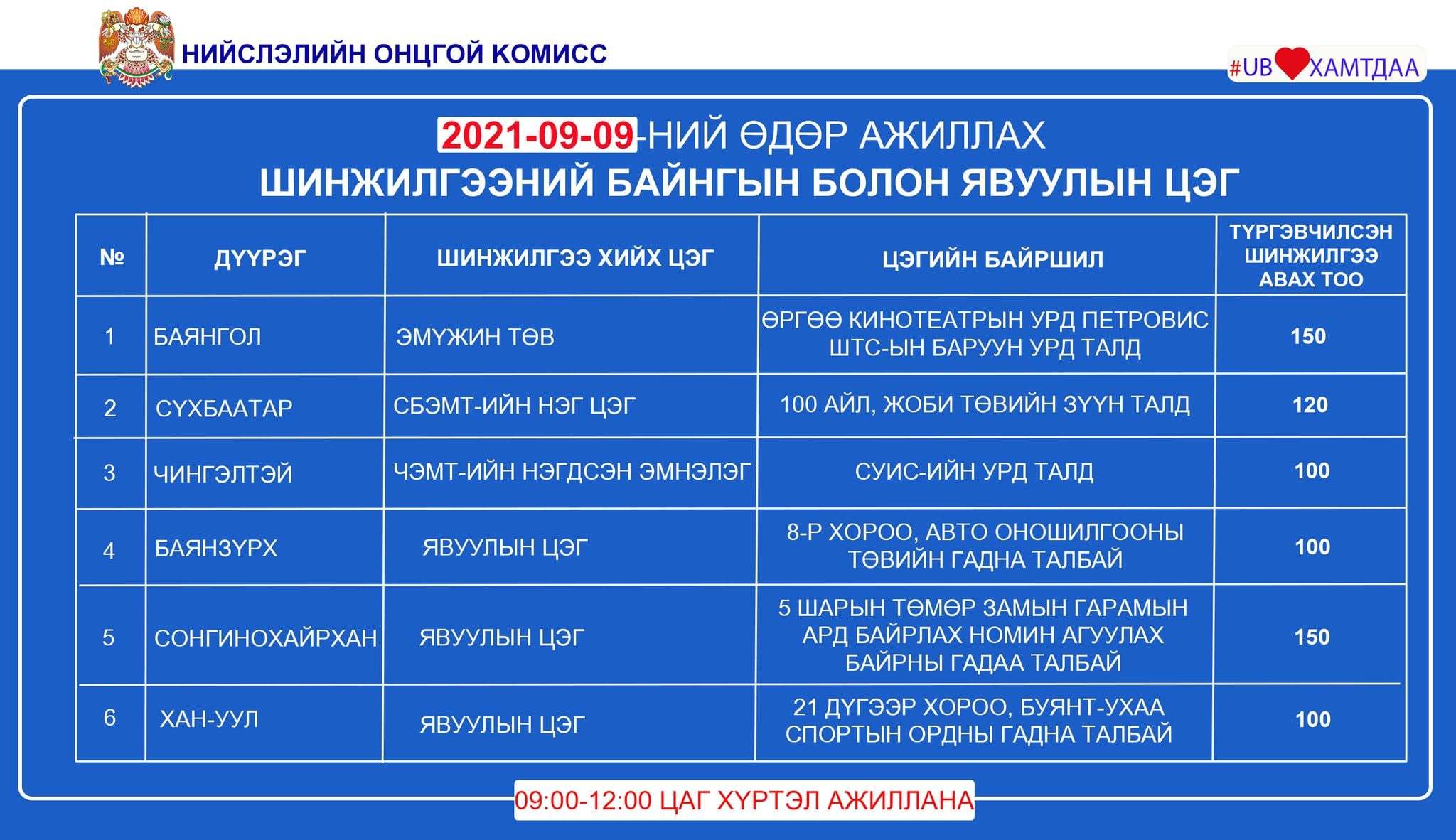 2021 оны есдүгээр сарын 9-нд ажиллах шинжилгээний байнгын болон явуулын цэгүүд
