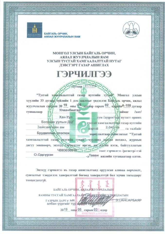 Тэрбээр “БОАЖ-ын 2019 оны А-158 дугаар тушаалаар иргэн О.Одсүрэнд 2.041га газар олгосон байна. Зочид буудал аялал жуулчлалын зориулалттай. Гэхдээ Нийслэлээс барилгын ажил эхлүүлэх зөвшөөрөл олгоогүй. Газар дээр нь очиж шаардлага тавин ажиллаж байна” гэжээ.