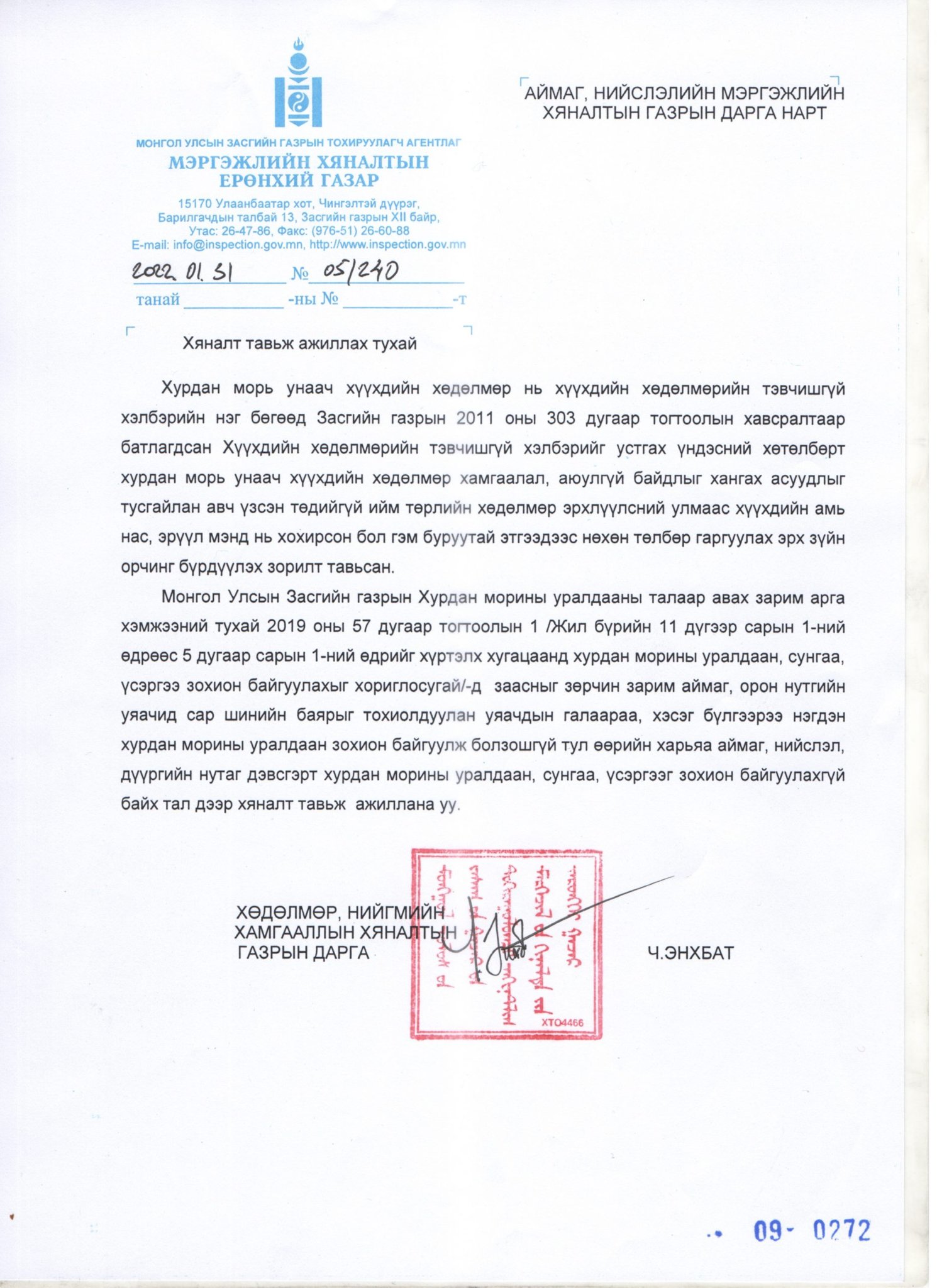 Жил бүрийн өвөл, хавар хурдан морины уралдаан зохион байгуулах, хүүхдийн эрүүл мэнд, амь насанд аюул учруулах зөрчил багагүй гардаг. Иймээс Мэргэжлийн хяналтын ерөнхий газрын Хөдөлмөр, нийгмийн хамгааллын хяналтын газраас аймаг, нийслэлийн Мэргэжлийн хяналтын газруудад албан тоот хүргүүллээ. Уг албан тоотод “…өөрийн харьяа нутаг дэвсгэрт хурдан морины уралдаан, сунгаа, үсэргээг зохион байгуулахгүй байх тал дээр хяналт тавьж ажиллах”-ыг анхааруулав.
