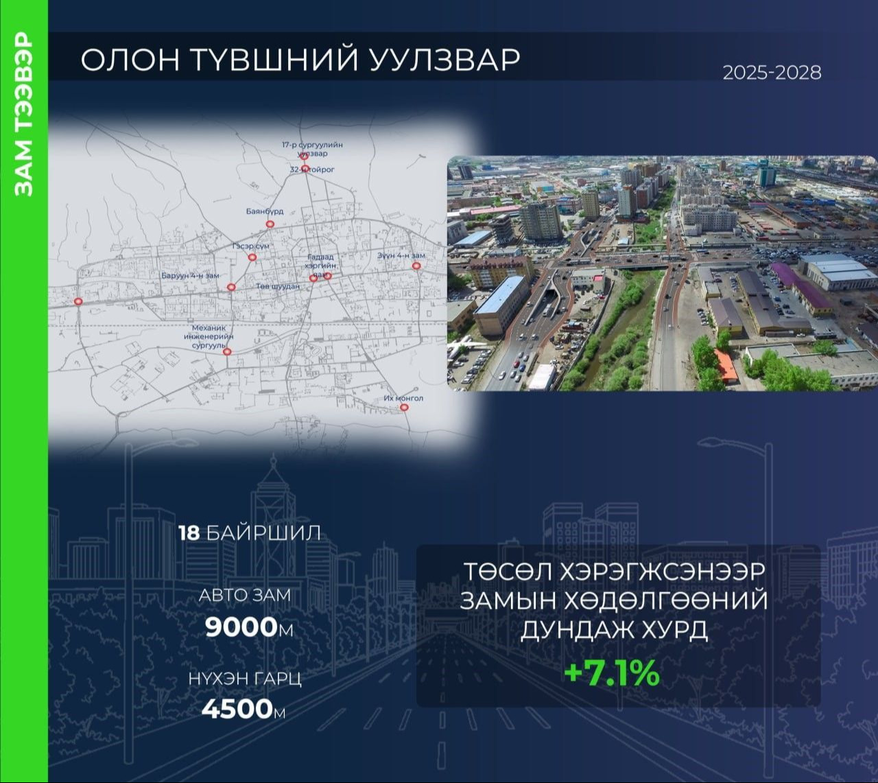 Нийслэлд орчин үеийн стандарт бүхий, аюулгүй, тасралтгүй урсгалтай авто замын сүлжээг бий болгох, хотын замын түгжрэлийг бууруулах, хөдөлгөөний үр ашгийг нэмэгдүүлэх зорилгоор “Олон түвшний уулзвар” төслийг нийт 18 байршилд үе шаттай хэрэгжүүлнэ. Энэхүү уулзварууд нь Баруун 4 зам, Саппоро, Механик инженерийн сургууль (МИС), Төв шуудан, Гэсэр сүм, Баянбүрд, 32-ын тойрог, 17 дугаар сургуулийн уулзвар, Гадаад хэргийн яам, Зүүн 4 зам, Их Монгол зэрэг хотын хөдөлгөөний хамгийн их ачаалалтай зангилаануудыг хамрахаар төлөвлөсөн.