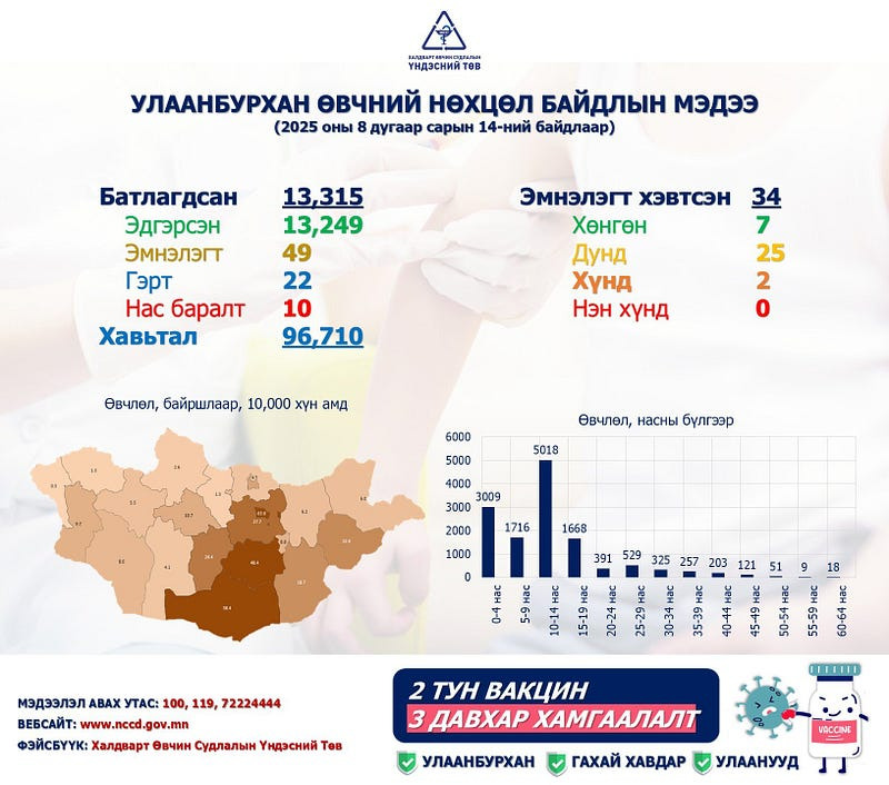 Халдварт өвчин судлалын үндэсний төвөөс гаргасан мэдээллээр, 2025 оны наймдугаар сарын 14-ний байдлаар улаанбурхан өвчний нийт батлагдсан тохиолдол 13315 болжээ.