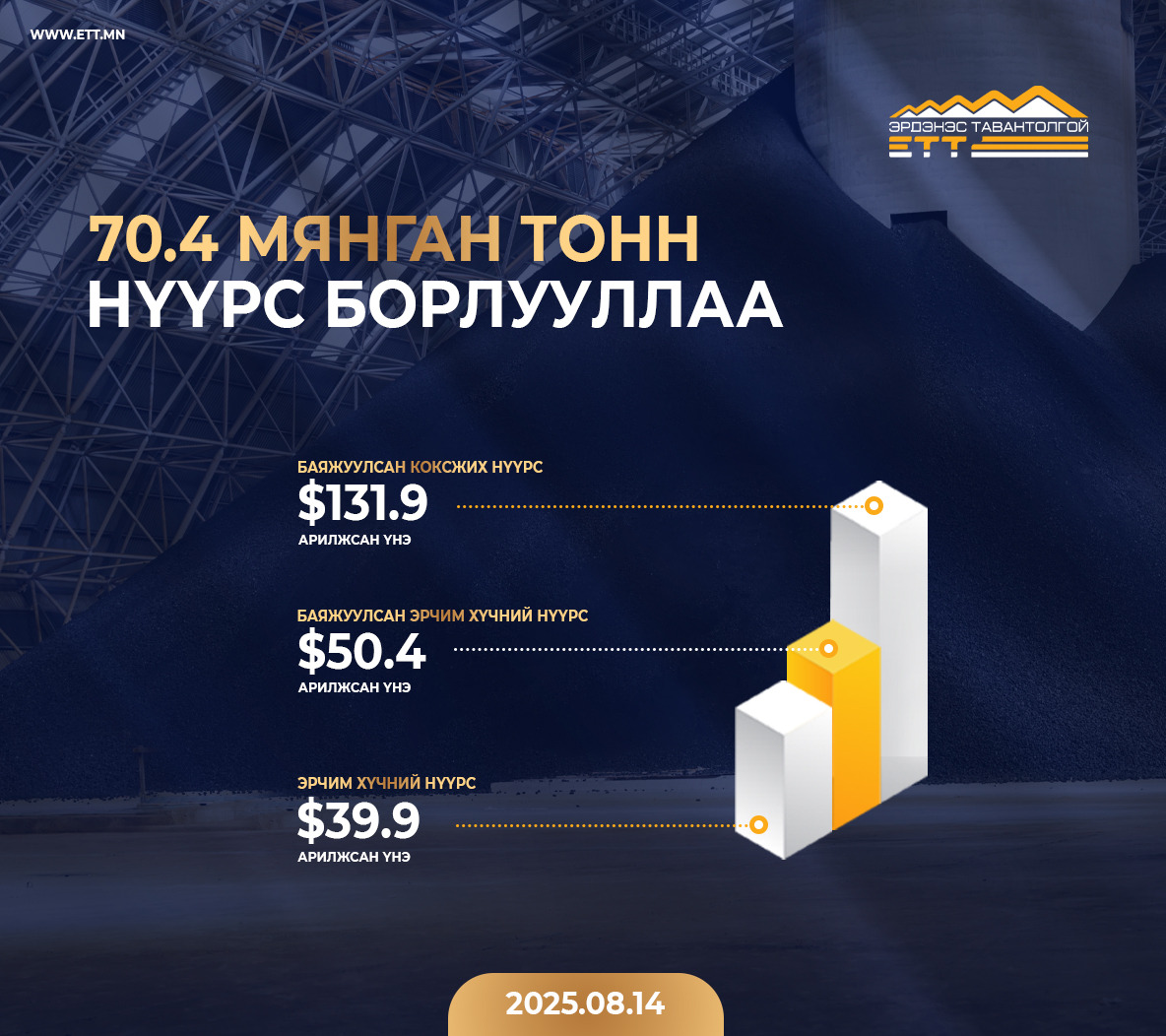 "Эрдэнэс Тавантолгой" ХК 2025 оны 8 дугаар сарын 14-ний өдөр Монголын Хөрөнгийн Биржээр дамжуулан 3 удаагийн арилжаагаар 19.2 мянган тонн баяжуулсан коксжих нүүрс, 19.2 мянган тонн баяжуулсан эрчим хүчний нүүрс, 32.0 мянган тонн эрчим хүчний нүүрс, нийт 70.4 мянган тонн нүүрс БНХАУ-ын Ганцмод боомт хүргэж өгөх нөхцөлөөр амжилттай арилжааллаа.Баяжуулсан коксжих нүүрсний үнэ 131.9 ам.долларт, баяжуулсан болон баяжуулаагүй эрчим хүчний нүүрсний үнийн хувьд 50.4 ам.доллар болон 39.9 ам.долларт тус тус хэлцэл хийгдлээ.Зах зээлийн уналттай энэ үед нүүрсний борлуулалтыг тасралтгүй явуулах, сорчлохгүйгээр олборлох, борлуулах бодлогын хүрээнд шат дараатай арга хэмжээнүүдийг авч хэрэгжүүлж байна. Онцгой дэглэм тогтоосноос хойш 1 сарын хугацаанд Биржээр 22 удаагийн арилжаагаар 94.5 сая ам.долларын үнэлгээ бүхий 1.44 сая тонн нүүрс борлуулаад байна.