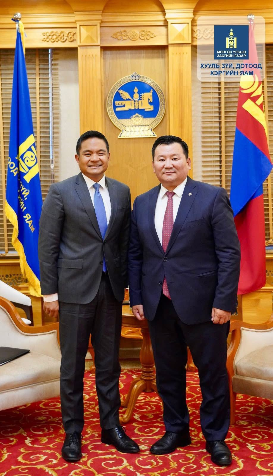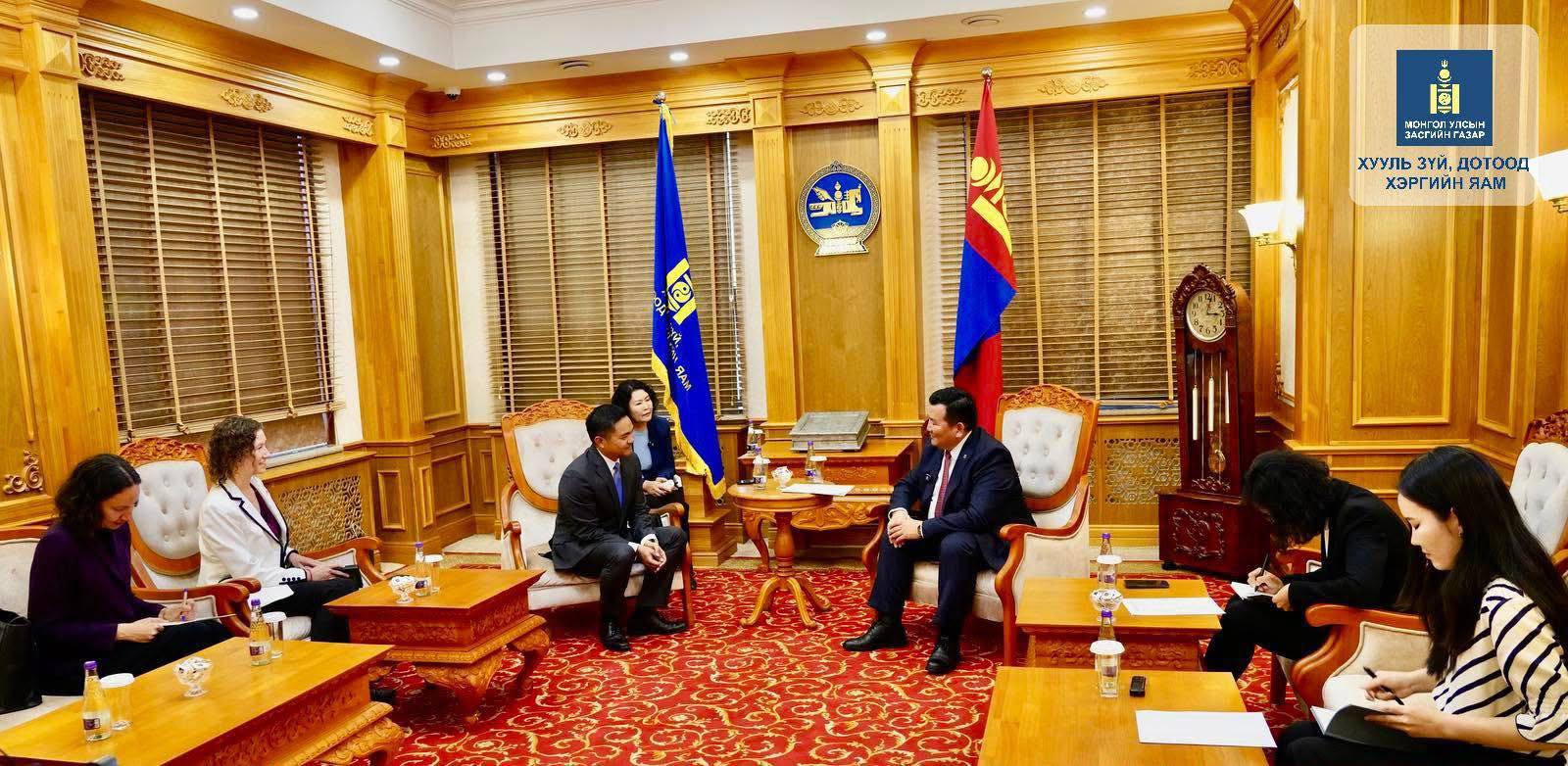 Хууль зүй, дотоод хэргийн сайд Л.Мөнхбаатар өнөөдөр (2025.08.20) Америкийн Нэгдсэн Улсаас Монгол Улсад суугаа Онц бөгөөд Бүрэн эрхт Элчин сайд Ричард Буанганыг хүлээн авч уулзлаа. Уулзалтын эхэнд Л.Мөнхбаатар сайд ноён Элчин сайдад хандан салбарт хэрэгжүүлэхээр ажиллаж буй тэргүүлэх бодлого чиглэлийнхээ талаар мэдээлэл өглөө. Тодруулбал, “Эрх зүйн шинэтгэл-2” хөтөлбөр хэрэгжүүлэх, улсын хэмжээнд мөрдөж буй хууль, тогтоомжуудад хүний эрхийн үнэлгээ хийж холбогдох арга хэмжээ авах, “Эдийн засгийг эрх зүйгээр дэмжих” хөтөлбөр болон хөтөлбөрийн хүрээнд гадаадын хөрөнгө оруулалтыг хамгаалах талаар хууль, дүрмүүдэд өөрчлөлт оруулах чиглэлд ажиллаж эхэлсэн талаар дурдав. Хариуд нь Элчин сайд Ричард Буанган “Таны тэргүүлэх чиглэлээ болгож байгаа эрх зүйн шинэтгэлд би хувьдаа сэтгэл хангалуун байна. Эдийн засаг нээлттэй байх тусмаа өсөлт сайжирна. Энэ чиглэлд дэмжиж, хамтран ажиллахад нээлттэй” гэж мэдэгдлээ. Түүнчлэн АНУ-ын Ерөнхийлөгч Д.Трампын Засаг захиргаанаас гадны улсуудад үзүүлдэг тусламж, хөрөнгө оруулалтаа дахин хянаж үзээд Монгол Улсын ХЗДХЯ-тай өнгөрсөн 5 жилийн хугацаанд хамтран хэрэгжүүлсэн “Хүүхэд хамгааллын түншлэлийн компакт: хүн худалдаалахаас хүүхдийг хамгаалах нь” төслийн үр дүнг өндрөөр үнэлж, санхүүжилтийг үргэлжлүүлэн олгохоор шийдвэрлэсэн талаар дуулгалаа. Түүнчлэн талууд Элчин сайдын яамны дэмжлэгтэйгээр, АНУ-ын Төрийн департаментын Олон улсын хар тамхи, мансууруулах бодистой тэмцэх, хууль сахиулах товчоо (INL)-ны санхүүжилтээр Монгол Улсын хууль сахиулах салбарт хэрэгжүүлсэн болон хэрэгжүүлж буй төсөл, хөтөлбөрүүдийн үр дүн хийгээд салбарын бусад асуудлаар нээлттэй санал солилцлоо. Уулзалтад ХЗДХЯ-ны Олон улсын гэрээ, гадаад хамтын ажиллагааны газрын дарга Ч.Нарантуяа, АНУ-аас Монгол Улсад суугаа Элчин сайдын яамны Бүс нутгийн аюулгүй байдлын хэлтсийн дарга Сара Бэт Машл, Улс төрийн хэлтсийн дарга Эмма Ломакс нарын төлөөлөл байлцав.