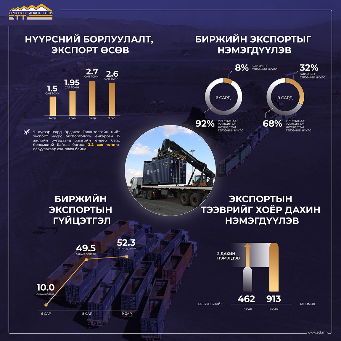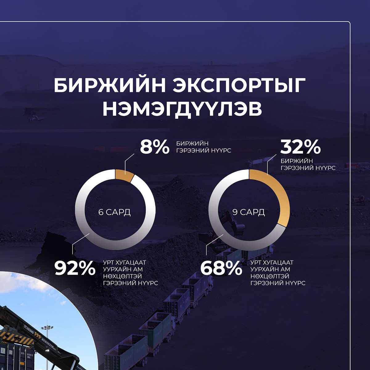 2025 оны 6 дугаар сард биржээр борлуулсан нүүрсний экспорт 8%, урт хугацаат уурхайн ам нөхцөлтэй гэрээний нүүрс 92% байсан бол 9 дүгээр сард биржийн нүүрсний экспорт 32% болж нэмэгдлээ. Өөрөөр хэлбэл 2025 оны 6 сард биржийн экспорт 10 сая ам.долларын гүйцэтгэлтэй байсан бол 8 дугаар сард 49.5 сая ам.доллар, 9 дүгээр сард 52.3 сая ам.доллар болж биржийн экспортын орлого нэмэгдсэн үзүүлэлтэй байна. Салбар дундын уялдааг сайжруулснаар нүүрсний экспорт, тээвэр нэмэгдэж, гадаад валютын хэмжээ өсөж, эдийн засгийн өсөлтийг хангахад бодитой хувь нэмэр оруулж байна.