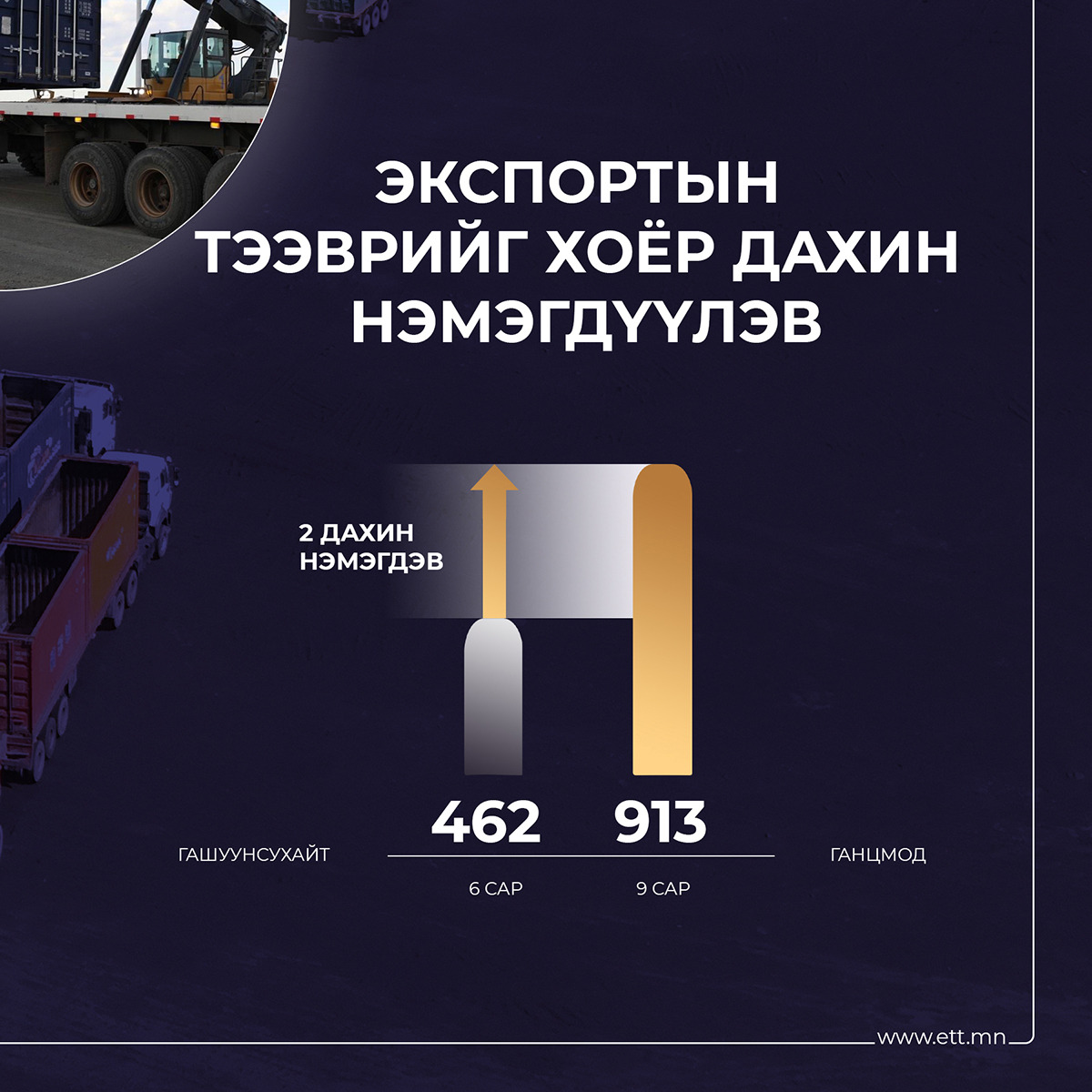 Экспортын хэмжээг нэмэгдүүлэхийн зэрэгцээ тээвэрлэлтийн хурдыг хоёр дахин нэмэгдүүллээ. Гашуунсухайт-Ганцмод боомтоор 2025 оны 06 дугаар сард 462 тээврийн хэрэгсэл гарч байсан бол 09 дүгээр сарын 22-ны өдрийн байдлаар 913 тээврийн хэрэгсэл тус боомтоор гарч тээвэрлэлт өмнөх сараас хоёр дахин нэмэгдлээ.