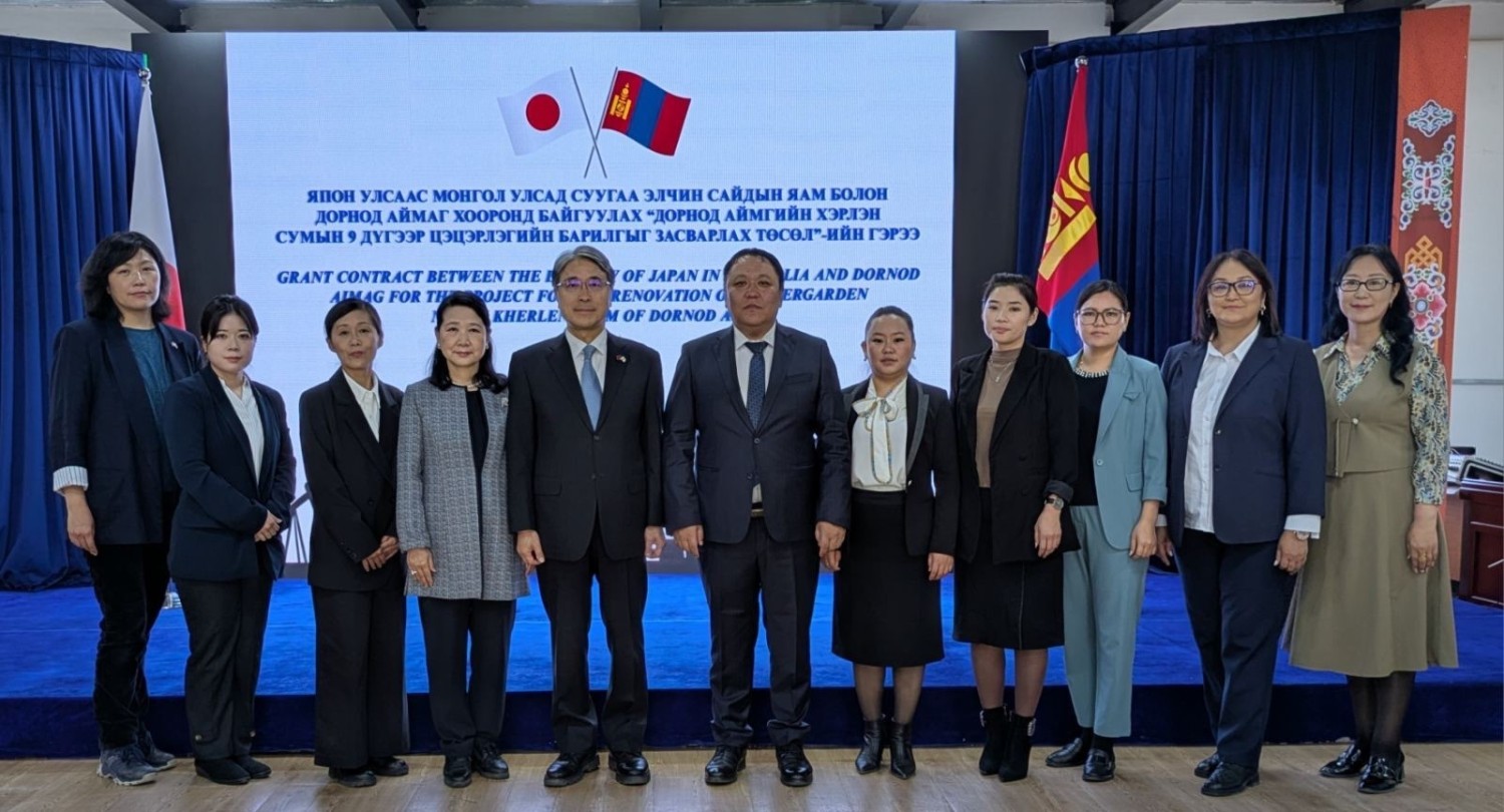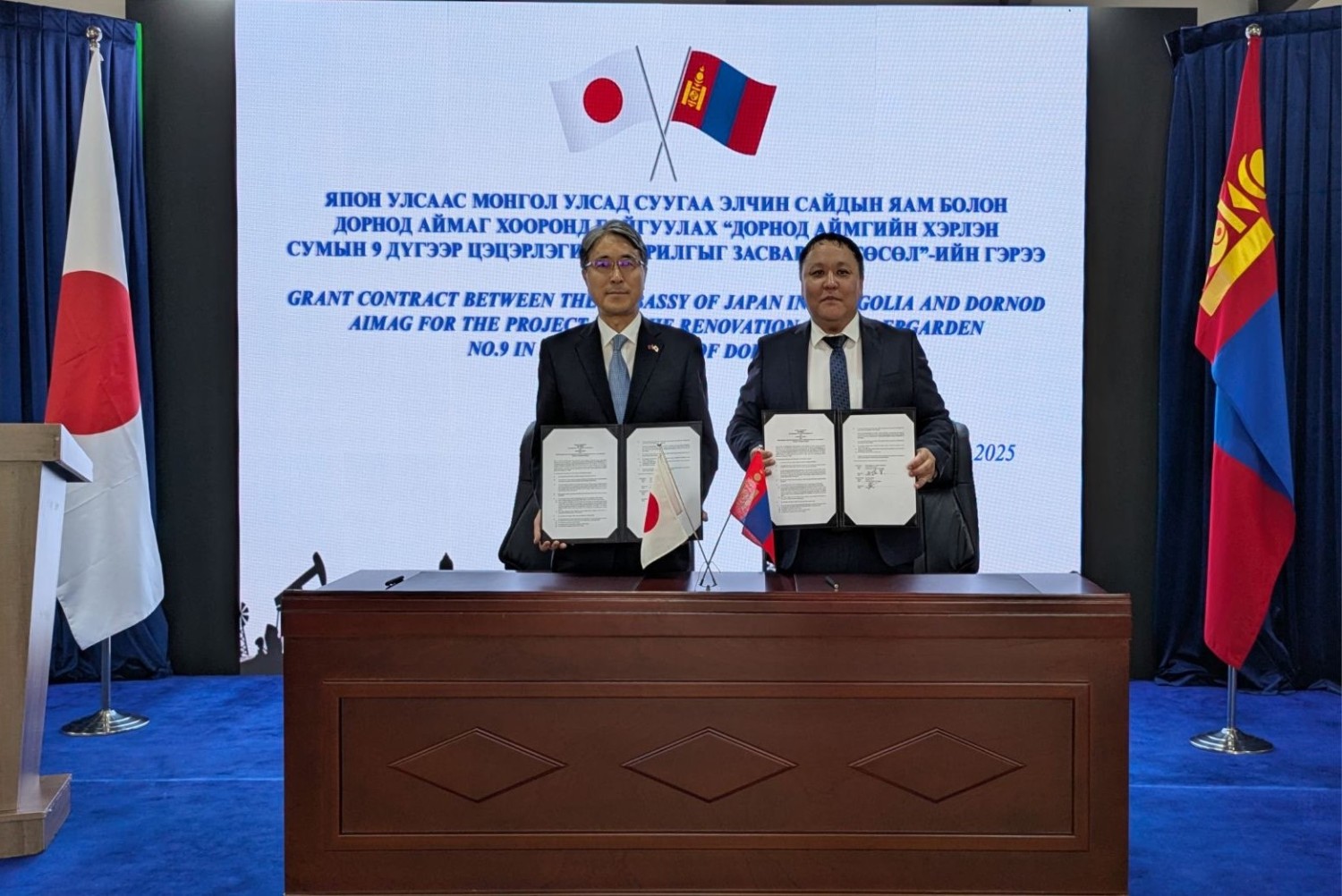 Япон Улсаас Монгол Улсад суугаа Онц бөгөөд Бүрэн эрхт Элчин сайд М.Игавахара болон Дорнод аймгийн Засаг дарга Ш.Ёл нар Япон Улсын Засгийн газрын 2025 оны “Өвсний үндэс - Хүний аюулгүй байдлыг хангах буцалтгүй тусламж”-ийн хөтөлбөрийн хүрээнд хэрэгжих “Дорнод аймгийн Хэрлэн сумын 9-р цэцэрлэгийн барилгыг засварлах төсөл”-ийн гэрээнд