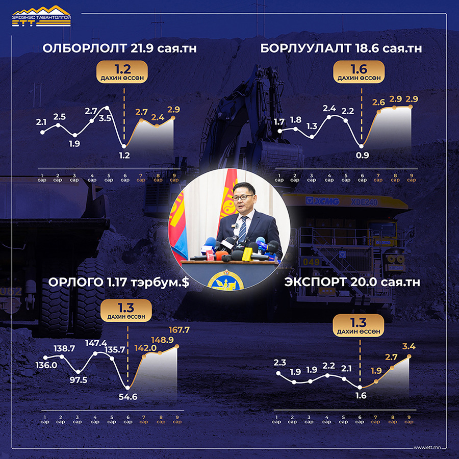 Түүнчлэн онцгой дэглэмийн хугацаанд нүүрсний экспортыг нэмэгдүүлж 2025 оны 07 дугаар сард 1.9 сая тонн, 08 дугаар сард 2.7 сая тонн, 09 дүгээр сард 3.2 сая тонн нүүрс Гашуунсухайт, Ханги боомтоор экспортоллоо. Есдүгээр сард экспортолсон нүүрсний хэмжээ “Эрдэнэс Тавантолгой” ХК-ийн бүх цаг үеийн хамгийн өндөр экспортын үзүүлэлт болсон нь онцгой дэглэмийн хугацаанд авч хэрэгжүүлсэн ажлын онцлох үр дүн байлаа.