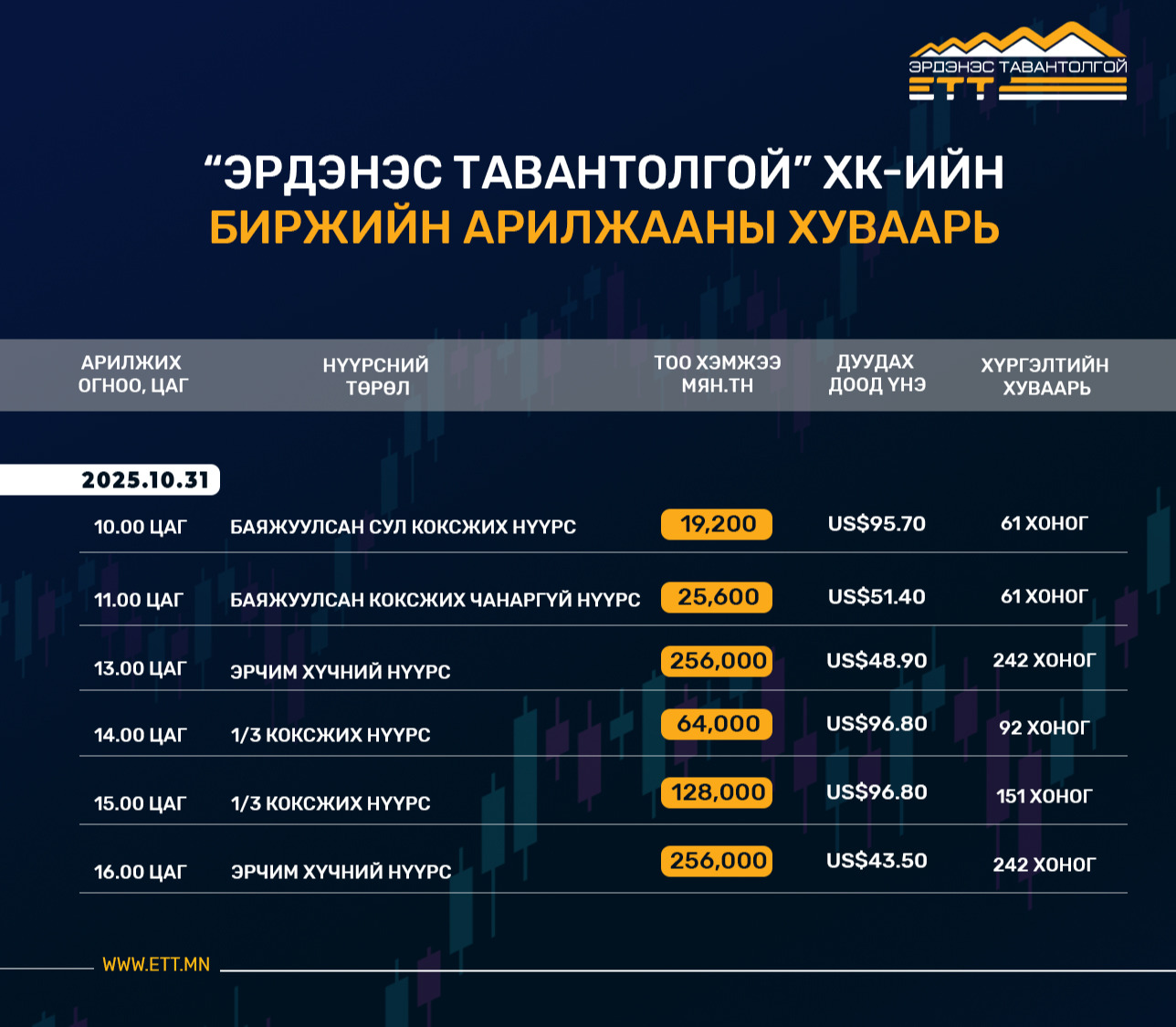 ЭРДЭНЭС ТАВАНТОЛГОЙ" ХК-ИЙН 2025 ОНЫ 10 ДУГААР САРЫН 31-НИЙ ӨДРИЙН БИРЖИЙН АРИЛЖААНЫ ХУВААРЬ