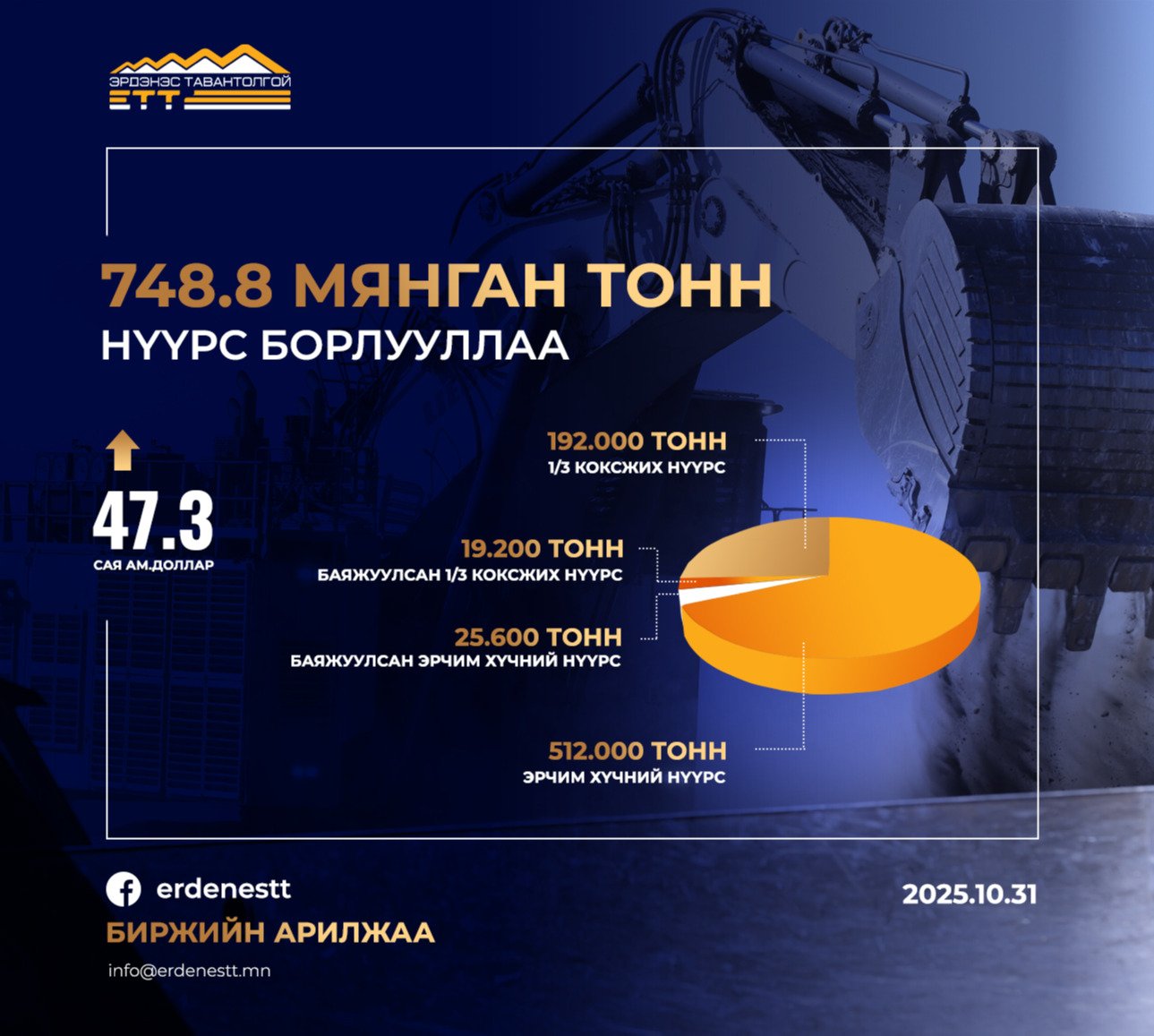 "Эрдэнэс Тавантолгой" ХК 2025 оны 10 дугаар сарын 31-ний өдөр Монголын Хөрөнгийн Биржээр дамжуулан 6 удаагийн арилжаагаар 748.8 мянган тонн нүүрс 47.3 сая ам.долларын үнийн дүнтэйгээр БНХАУ-ын боомт хүргэж өгөх нөхцөлөөр амжилттай арилжааллаа.