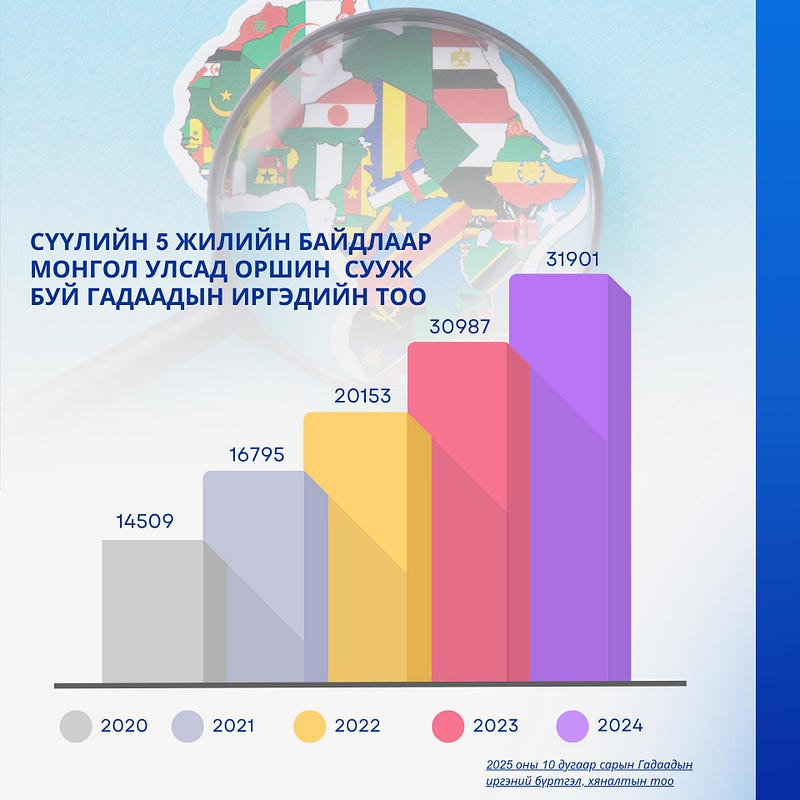 Хуулийн дагуу авч үзвэл Монгол Улсын харьяат хүн амын гурван хувь буюу 106345 гадаадын иргэн, үүнээс нэг улсын 35 мянга гаруй иргэн Монгол Улсад оршин суух боломжтой юм.