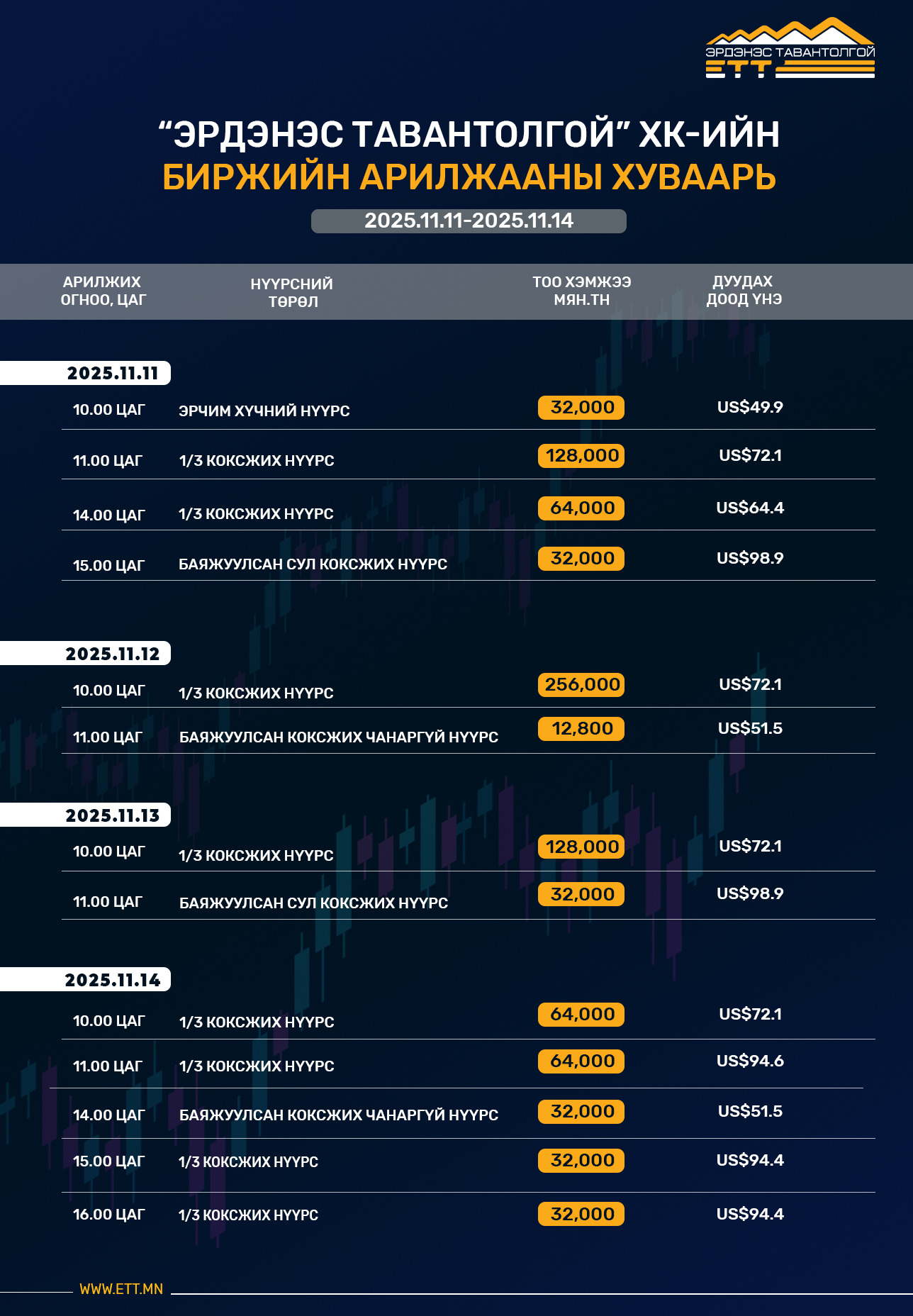 "ЭРДЭНЭС ТАВАНТОЛГОЙ" ХК-ИЙН 2025 ОНЫ 11 ДҮГААР САРЫН 11-14-НИЙ ӨДРҮҮДИЙН БИРЖИЙН АРИЛЖААНЫ ХУВААРЬ