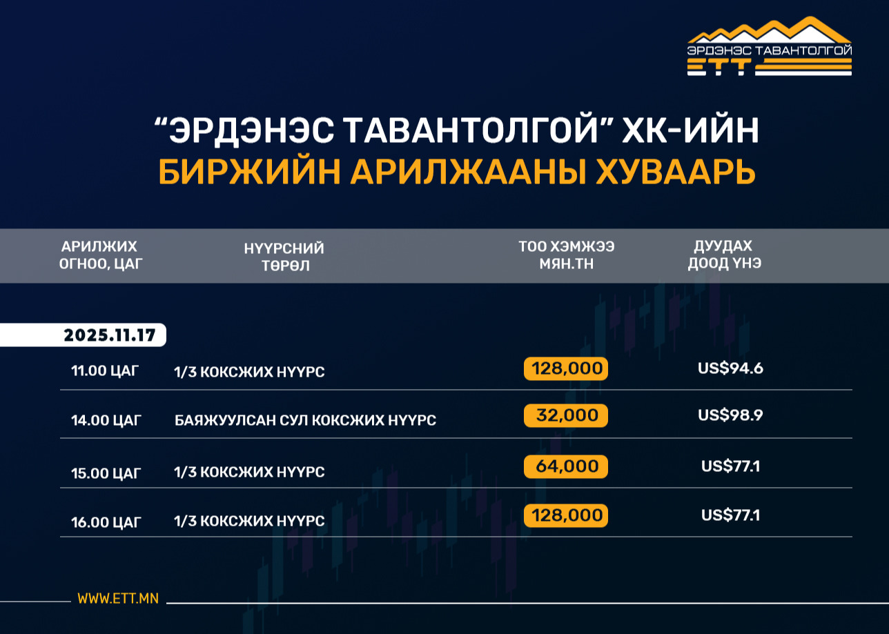 "ЭРДЭНЭС ТАВАНТОЛГОЙ" ХК-ИЙН 2025 ОНЫ 11 ДҮГЭЭР САРЫН 17-НЫ ӨДРИЙН БИРЖИЙН АРИЛЖААНЫ ХУВААРЬ