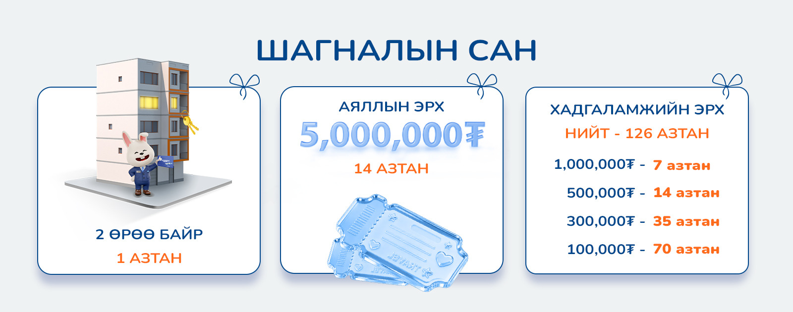 - Аяны туршид 6 сараас дээш хугацаатай хадгаламжийн харилцагчид дээд тал нь 1000ш сугалаа, 12 ба түүнээс дээш хугацаатай хадгаламжийн харилцагчид дээд тал нь 2000ш сугалаа олгоно.