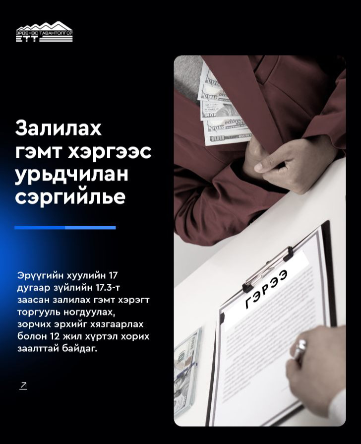 Бусдыг ажилд оруулна, нүүрсний гэрээ байгуулна, 1072 хувьцаа авна, зарна гэх мэт гэмт хэргийн шинжтэй залилан цахим орчинд үйлдэгдэж байгаа тул аливаа мэдээлэлд шүүлтүүртэй хандаж, хууран мэхлэх, залилах гэмт хэргээс урьдчилан сэргийлнэ үү.