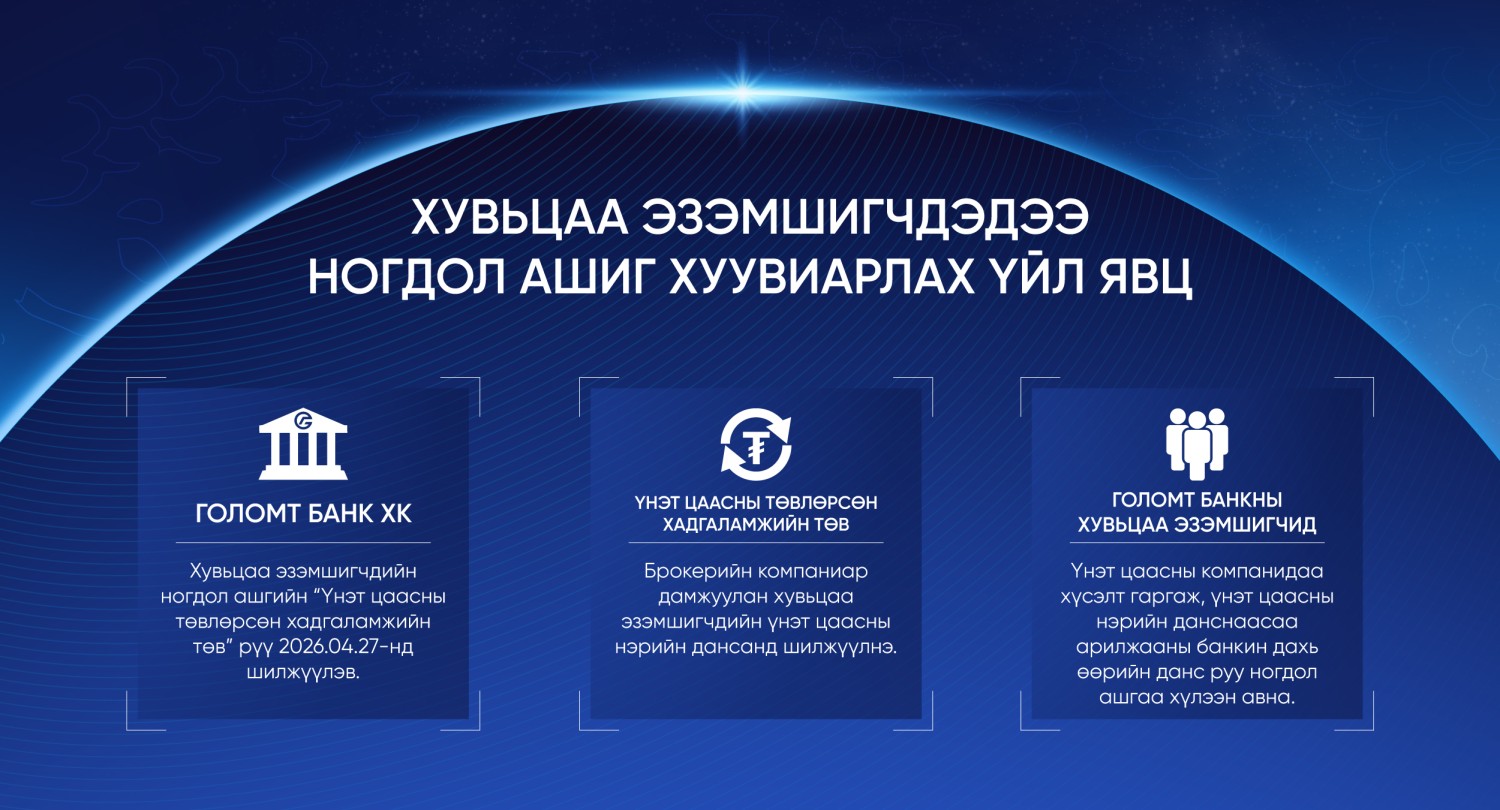 Ногдол ашиг хуваарилах тухайд Голомт банкны Төлөөлөн удирдах зөвлөлийн 2026 оны 2-р сарын 13-ний өдрийн ээлжит бус хурлаар 2025 оны цэвэр ашгаас хувьцаа эзэмшигчдэд нэгж хувьцаанд 80 төгрөг, нийт 64.7 тэрбум төгрөгийг мөнгөн хэлбэрээр хуваарилахаар шийдвэрлэсэн юм.