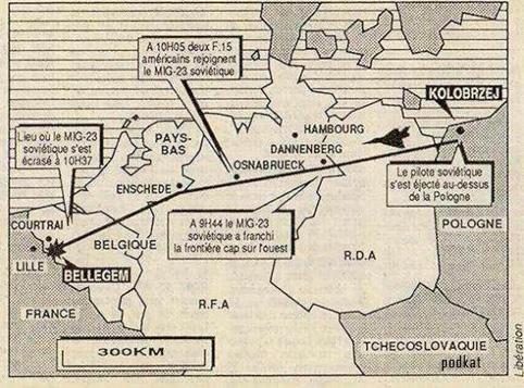 1989 оны долдугаар сарын 4-ний өглөөгүүүр белгийн нэгэн фермерийн хүү Вим де Лар хөдөө Кооихем тосгон дахь эцгийнхээ байшингийн сүүдрэвчинд сууж байхаа толгой дээр нь зөвлөлтийн сөнөөгч Миг-23М онгоц унаад ирэх юм гэж яаж санах билээ. Хэргийн газарт ирсэн цагдаагийнхан мэл гайхах нь тэр. ЗХУ-аас 1000 км-ийн зайд, Белги-Францын хилээс 15 км-т байх газарт далавчин дээрээ улаан таван хошуутай онгоц уначихсан байдаг. Хамгийн гол нь осол болсон газраас хөөрхий Вим де Ларынхаас өөр цогцос олддоггүй. Нисгэгч нь байдаггүй. Гэтэл нисгэгч нь осол болсон газраас бүр 900 км-ийн тэртээ Балтийн тэнгисийн эрэг дээр польшийн Колобжег хотын ойролцоо онгоцноосоо ослын үеинй шүхрээр буучихсан юмсанж.