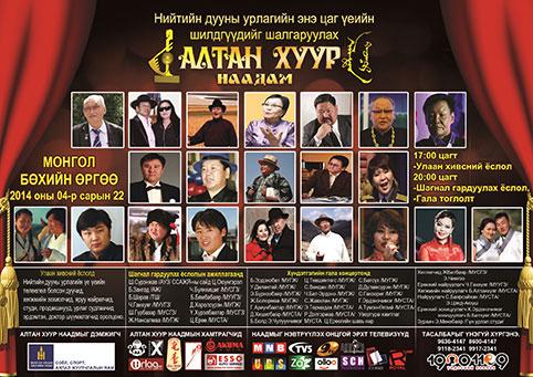 Нийтийн дууны урлагийн энэ цаг үеийн шилдгүүдийг тодруулах “Алтан хуур-2014” наадам энэ сарын 22-нд монгол бөхийн өргөөнөө зохион байгуулагдана. Тус наадам нь анх 2005 онд зохион байгуулагдаж 12 номинацид 68 уран бүтээлч өрсөлдөж шилдгүүдээ тодруулж байсан удаатай. Энэ жилийн хувьд “Алтан хуур” наадам нь нийтийн дууны урлагийнхны нэгдсэн улаан хивсний ёслолыг анх удаагаа зохион байгуулж байгаагаараа онцлог бөгөөд тус ёслолд