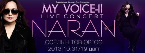 Монголын рок попын тайзыг өөрийн дуу хоолойгоороо хөглөдөг дуучин бол поп дива С.Наран. Тэрээр дөрвөн жилийн өмнө “MY VOICE” хэмээх анхны бие даасан тоглолтоо хийж байсан билээ. Байнга өмд,цамц, нүдний шилээр гангардаг байсан тэрээр энэхүү тоглолтон дээрээ өөртөө зохиосон даашинз өмсөн гарч ирсэн нь үзэгчдэд гэнэтийн бэлэг болж байсан удаатай. Тэгвэл поп дива дуучин бүсгүй энэ сарын 31-нд Соёлын төв өргөөнд 19:00 цагаас ганцхан удаа өөрийн дуу