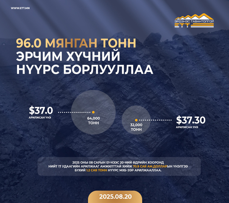 "Эрдэнэс Тавантолгой" ХК 2025 оны 8 дугаар сарын 19-ний өдөр Монголын Хөрөнгийн Биржээр дамжуулан 5 багц буюу 32.0 мянган тонн эрчим хүчний нүүрс 37.30 ам.доллароор, 8 дугаар сарын 20-ны өдөр 10 багц буюу 64.0 мянган тонн эрчим хүчний нүүрс 37.0 ам.доллароор тус тус амжилттай арилжааллаа.