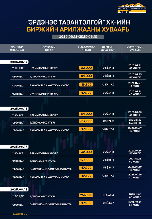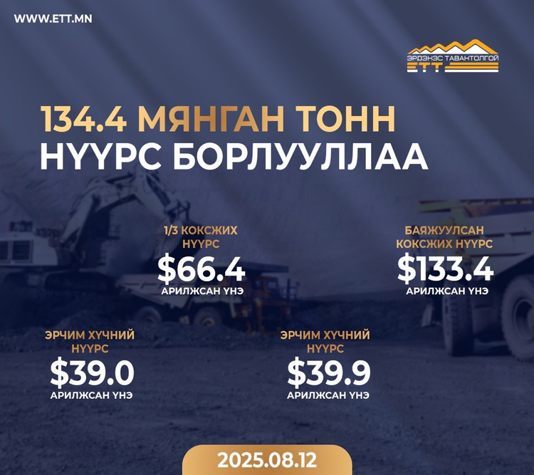 "Эрдэнэс Тавантолгой" ХК 2025 оны 8 дугаар сарын 12-ны өдөр Монголын Хөрөнгийн Биржээр дамжуулан 4 удаагийн арилжаагаар 19.2 мянган тонн баяжуулсан коксжих нүүрс, 64.0 мянган тонн 1/3 коксжих нүүрс, 51.2 мянган тонн эрчим хүчний нүүрс, нийт 134.4 мянган тонн нүүрс БНХАУ-ын Ганцмод боомт хүргэж өгөх нөхцөлөөр амжилттай арилжааллаа.