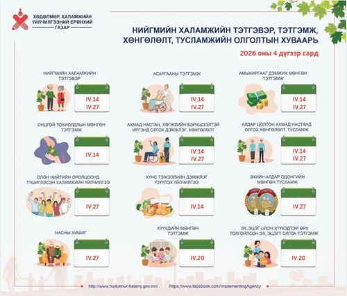 Халамжийн тэтгэвэр, тэтгэмж, хөнгөлөлт, тусламжийг энэ сард олгох хуваарь