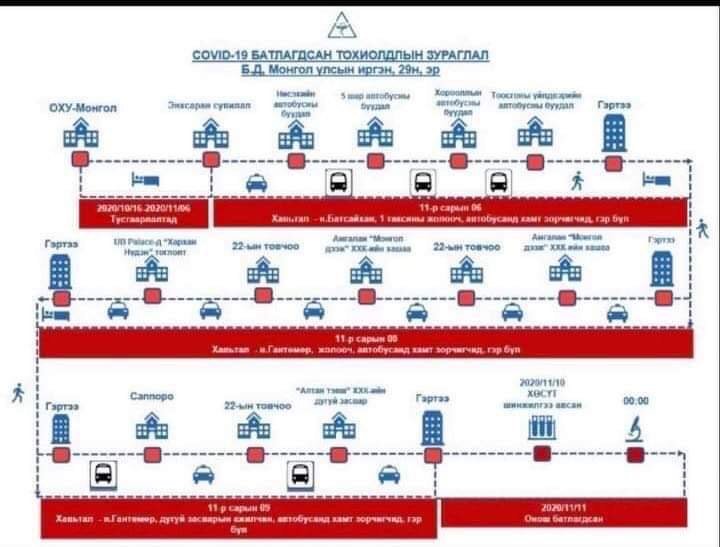 Сэлэнгэ аймагт 74 настай эмэгтэй хоёр удаагийн шинжилгээний хариу эерэг гарсан мэдээлсэн. Түүнд 11-р сарын 6-нд зовиур илэрсэн (38 хэм халуурсан) өгүүлэмжтэй, 9-нд эмнэлэгт хандан PCR шинжилгээ хийхэд халдвартай болох нь тогтоогдсон.