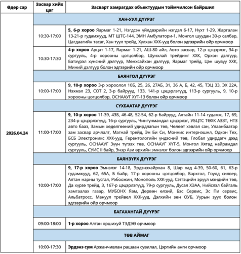 УБЦТС: Өнөөдөр цахилгаан шугам тоноглолд хийгдэх засвар үйлчилгээний хуваарь