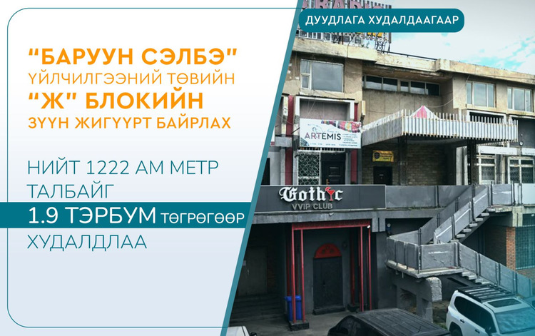 Дуудлага худалдаагаар “Баруун Сэлбэ” үйлчилгээний төвийн “Ж” блокийн зүүн жигүүрт байрлах нийт 1222 ам метр талбайг 1.9 тэрбум төгрөгөөр худалдлаа