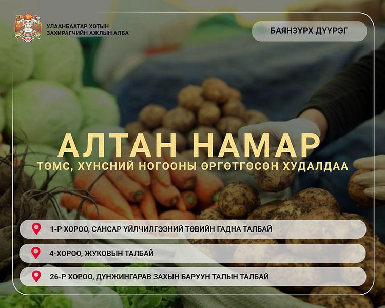 2025 оны наймдугаар сарын 04-ний өдрийн А/104 дугаар тушаалаар нийслэлийн 9 дүүрэгт “Алтан намар-2025” төмс хүнсний ногооны өргөтгөсөн худалдааг зохион байгуулахаар 21 байршлыг баталсан. Одоогоор дөрвөн байршилд худалдаа эхлээд байна.