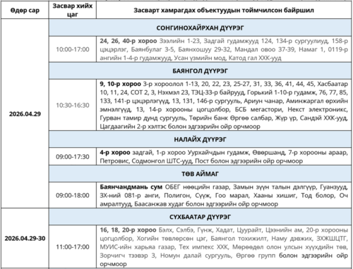 Өнөөдөр цахилгаан шугам тоноглолд хийгдэх засвар үйлчилгээний хуваарь